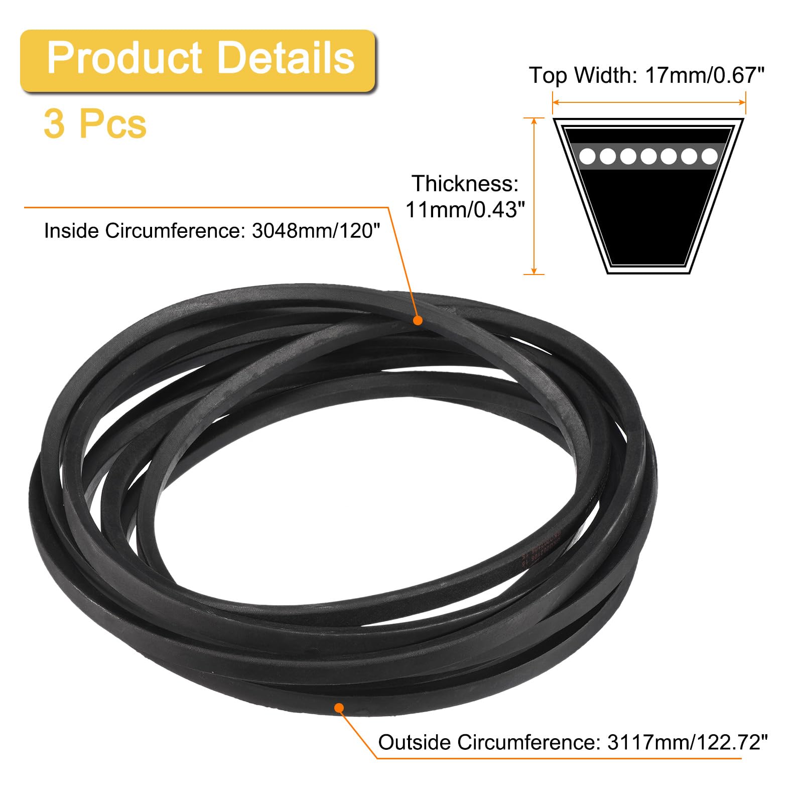 [What You Get] - Package comes with 3 piece of v-belt, with 11mm/0.43inch in thickness, 3117mm/122.72inch in outside circumference, 3048mm/120inch in inside circumference, 17mm/0.67inch in top width.