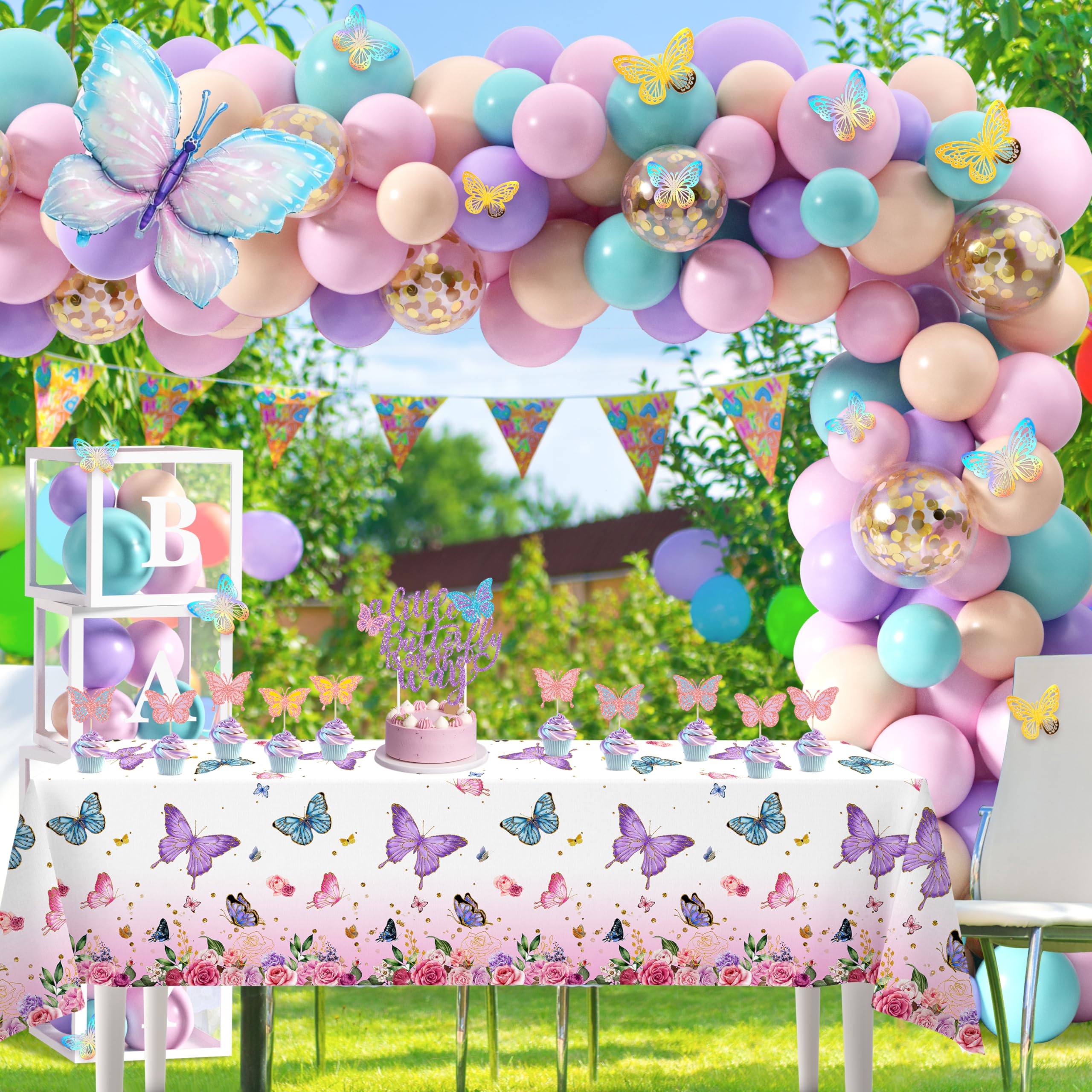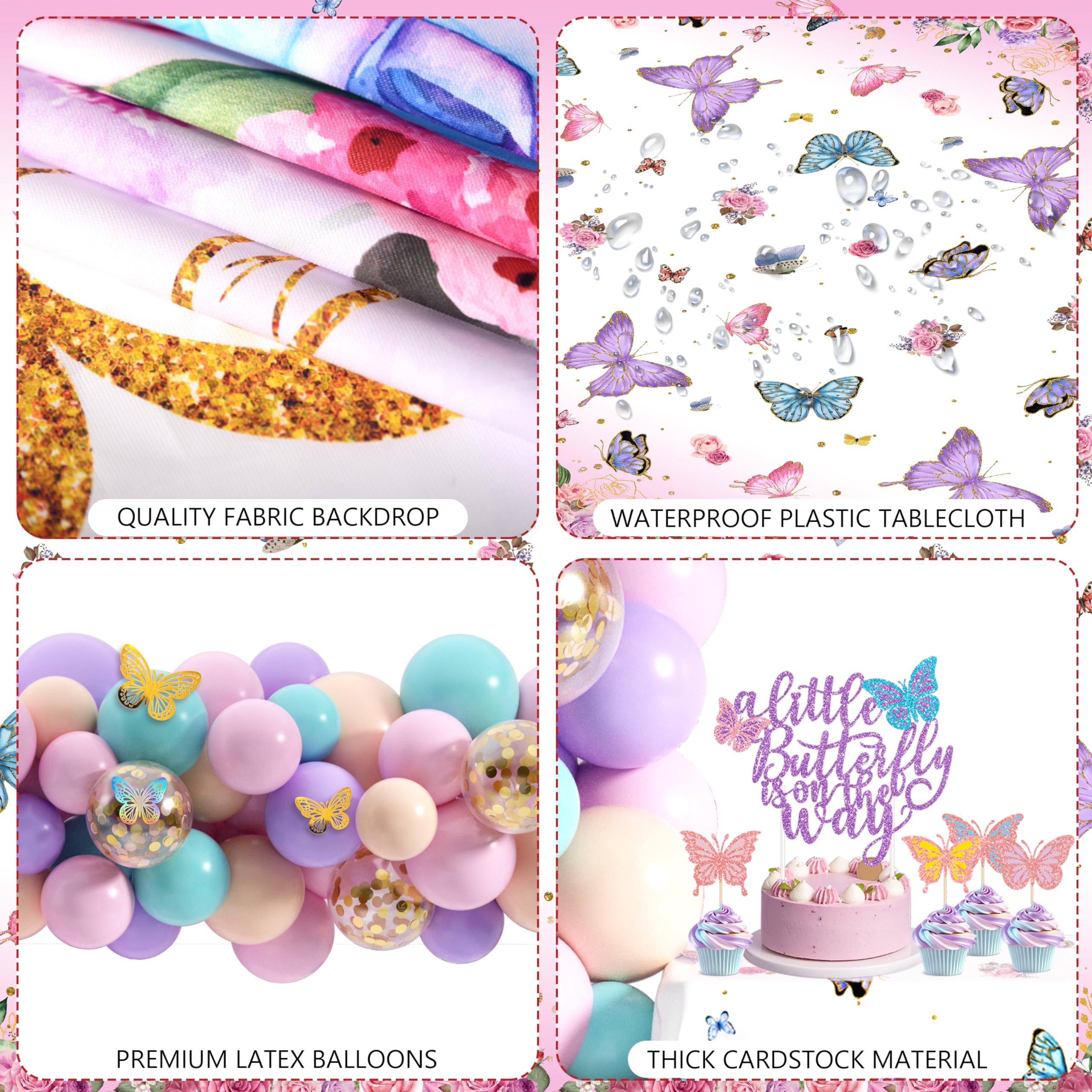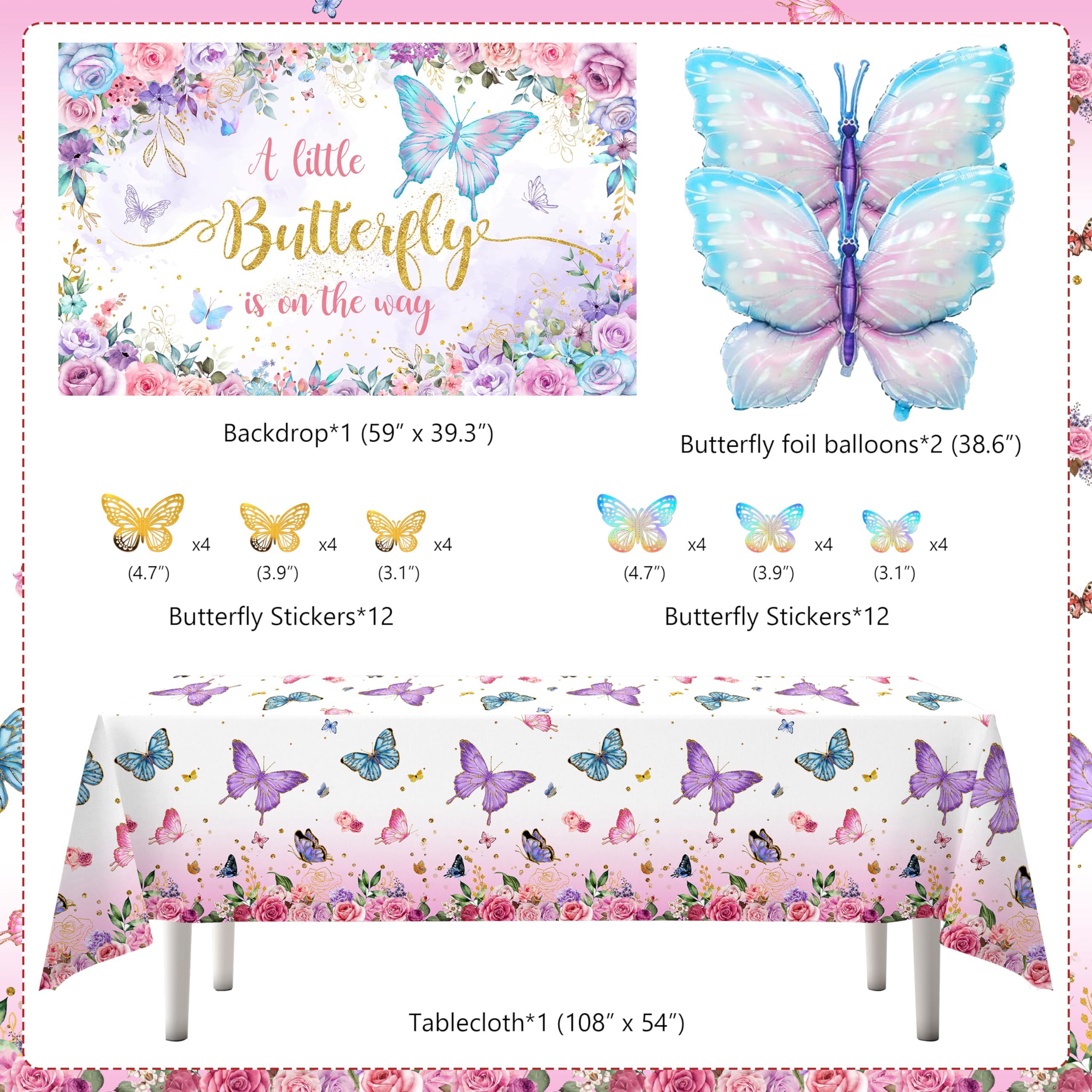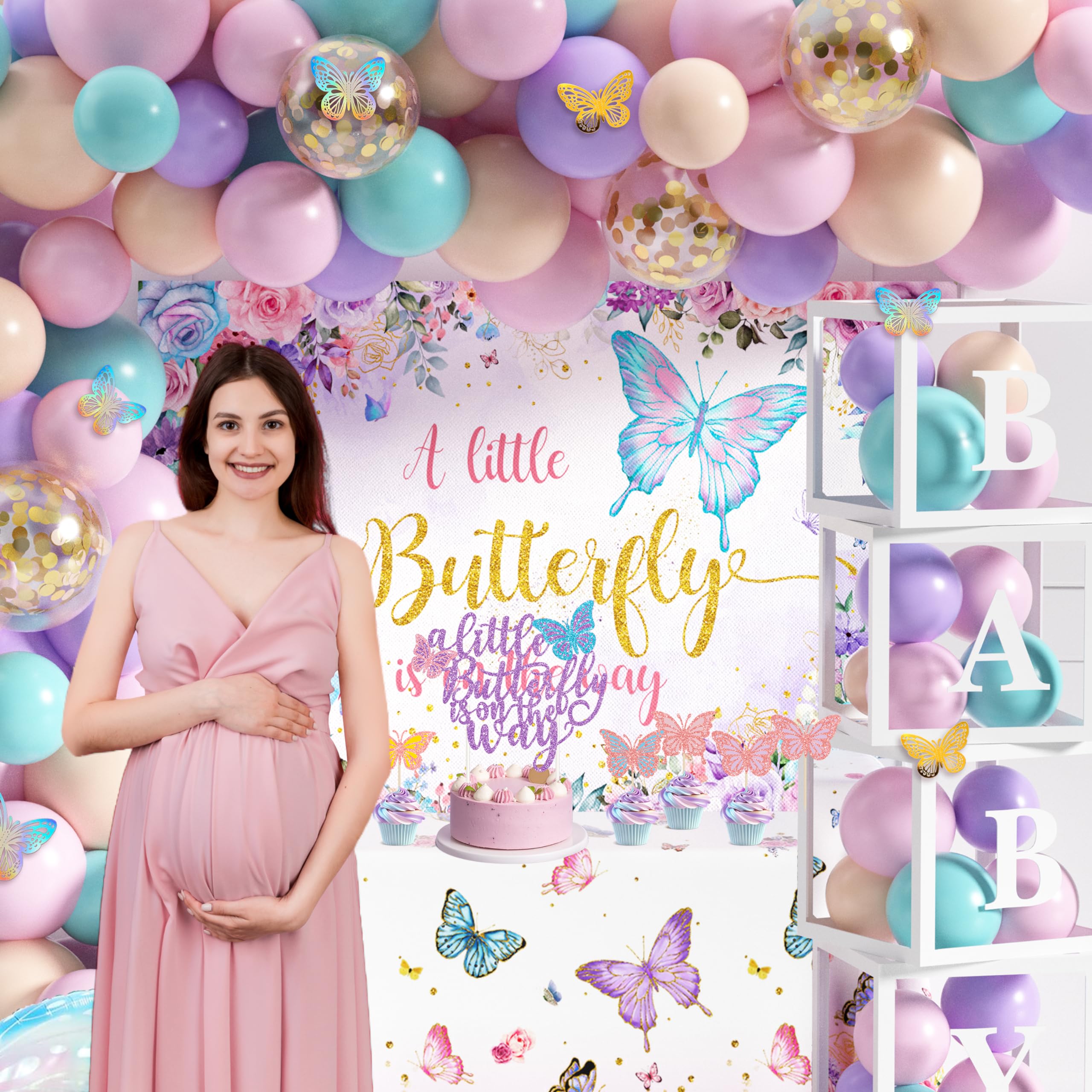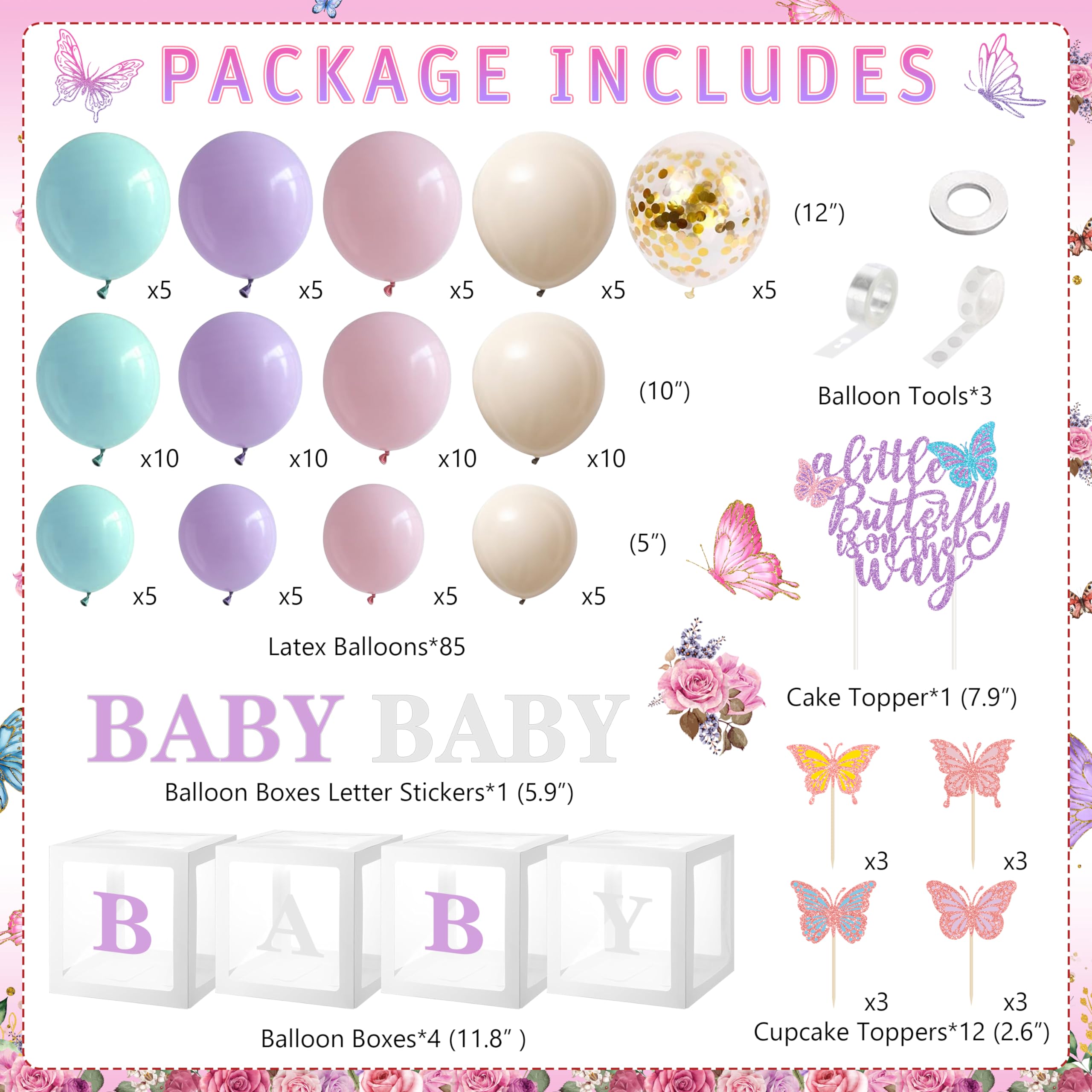 Butterfly Baby Shower Decorations for Girls -- Include 85 latex balloons, 1 A Little Butterfly is On The Way backdrop, tablecloth, cake topper, 12 cupcake toppers, 24 butterfly stickers with different colors and sizes, 2 butterfly foil balloons, 4 baby boxes with 2 set letter stickers and 3 balloon tools, 133 pcs in total.