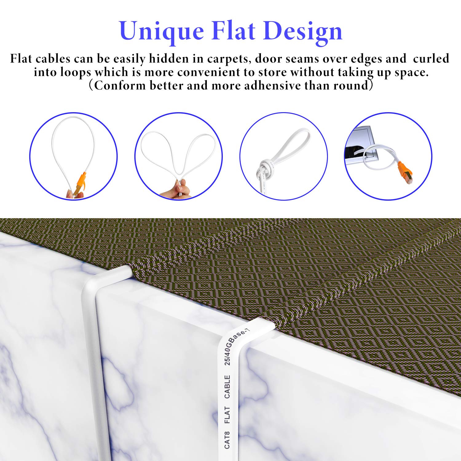 Space Saving: Cat 8 RJ45 cable adopts optimized flat shape design, easy to install, more flexible and perfectly fit the corner, it can be easily hidden in the carpet, door cracks and other places, more space saving. If you don't need the whole length, you can easily roll it into a loop, effectively avoiding tangles. Our Cat 8 network cable provides optimal EMI/RFI interference protection and long-distance data transmission to better protect signal quality