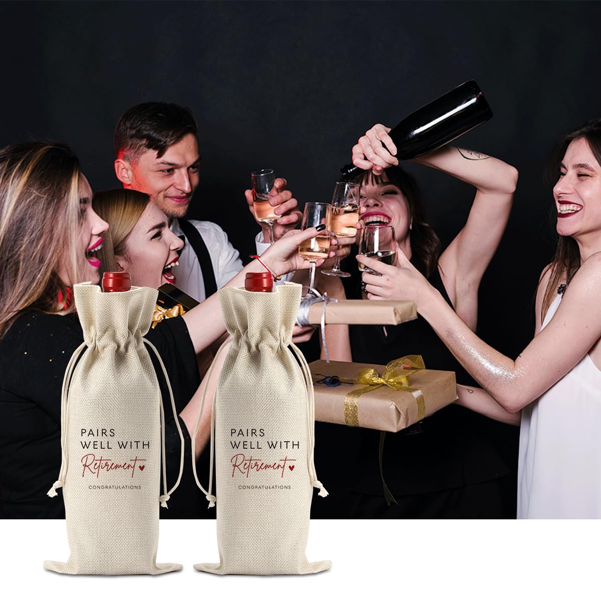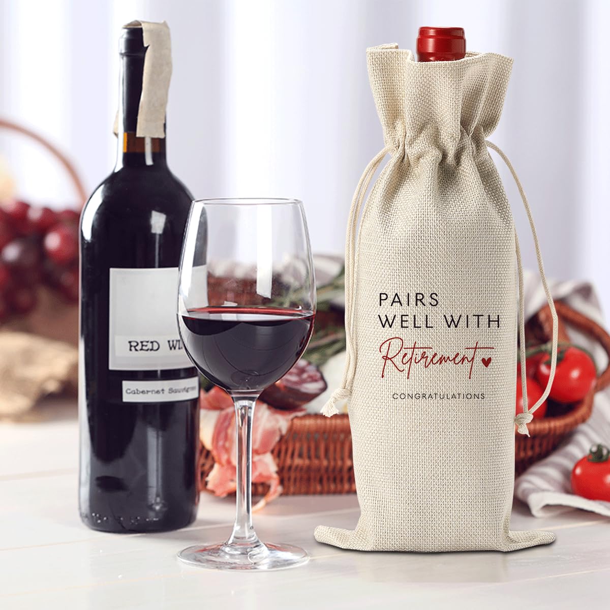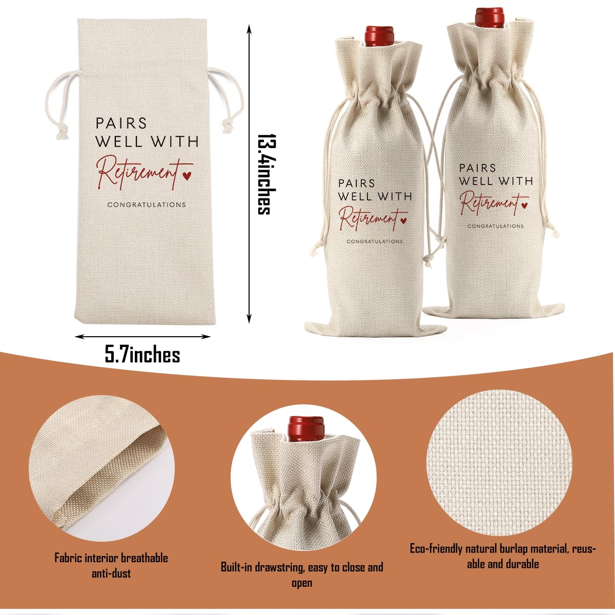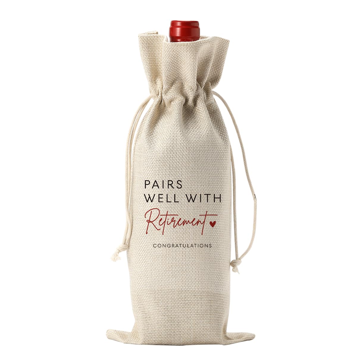 【Wine Bag With Drawstring Setup】Our retirement wine bag is made from high-quality burlap, measures 5.6'' x 12.9'', and features a drawstring design that makes it very easy to open and close. But Just be mindful of the size of the bottle you choose! A "regular" sized wine bottle would be the best choice to fill the bag. Be suitable for most regular sized 750ml single wine, champagne. Adding a bottle of wine is a great gift!