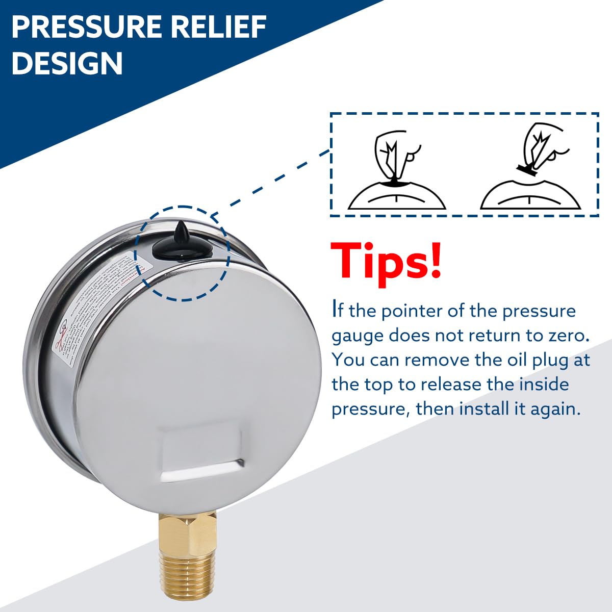 The circular dial is enclosed in a 304 stainless steel case for corrosion resistance. Glycerin-filled inhibits pointer flutter and prevents damage to the internal mechanics from vibration and pulsation.