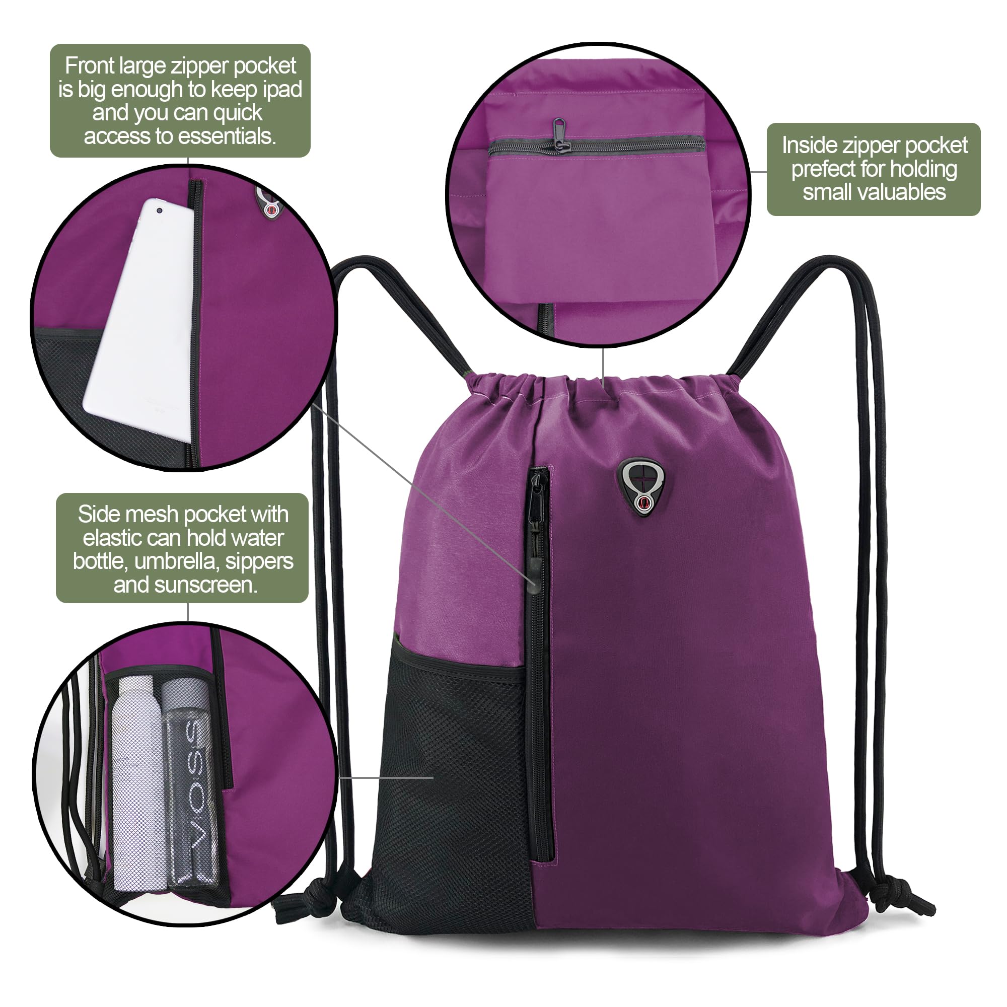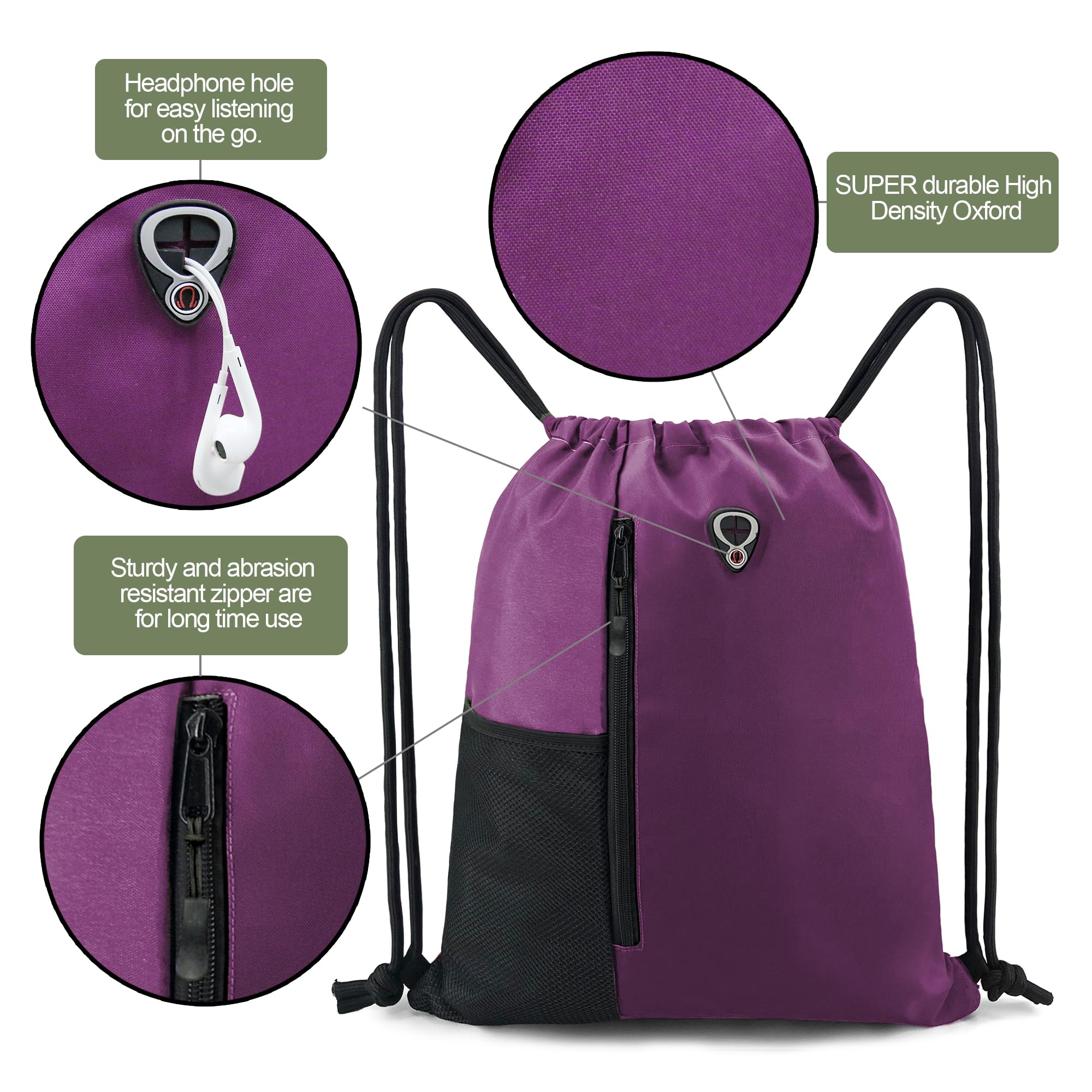 Description Lightweight drawstring backpack bags with main large compartment and large front zipper pocket which can hold all the items you need to get to in a hurry. ✔300 denier High Density Oxford - easy-load wide cinch opening - front zipper pocket - inside zipper pocket-designed for carrying on as a backpack.with an eye-catching two-tone polyester construction. ✔Dimensions: 16"w x 20"h for main compartment- 10"w x 20"h front zippered pocket-7"w x 7"h inside zippered pocket. Best sackpack for gym, college, work or traveling. You can use it for storage of your sports shoes, or place your workout clothes like shirts, pants or any other athletic clothes. You can even put your gadgets and other stuff. ✔The cinch sack bag also have super long ribbon ring inside which can hold your keys and help you to find keys easily and take out directly to open the door. ✔Headphone hole on front pocket of sacpack for easy listening on the go. ✔Super sturdy PP ropes and abrasion zipper are for long time use. Plus the secure sewing these bags will last for years.You can untie and re-tie strings to adjust cord to where you want it so you can have it as low or high as you would like. ✔Carry around your gym or swim outfit in this large drawstring backpack bags. these custom drawstring backpack bags with pockets are slung over the back and out of your way. Drawstring backpack bags for Men & Women is ideal for gym, sports practice or other activities. ✔No more worry about polluting your bag because these drawstring bags are machine washable, reusable and durable. ✔Our drawstring gym backpack with zipper is the perfect size and affordable, perfect quality bag for all your custom needs such as sports teams, beach,vacation,educational centers, corporate offices, summer camps,Outdoor hiking and gyms can all benefit from these sackpack zipper bags.
