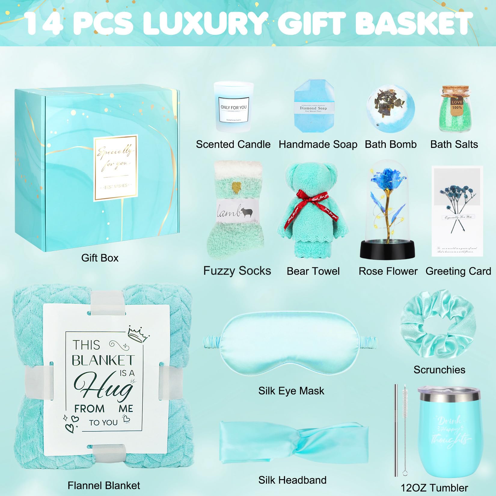 14PCS SELF CARE GIFTS FOR WOMEN: This get well soon gift basket for women includes a luxurious blanket, 12oz insulated tumbler with straw and cleaning brush, oceans-scented candle, handmade soap, bath bomb, bath salts, rose flower, bear-shaped towel, cozy fuzzy socks, silk eye mask, silk headband, scrunchies, and gift card. All items are packaged in a customized gift box.