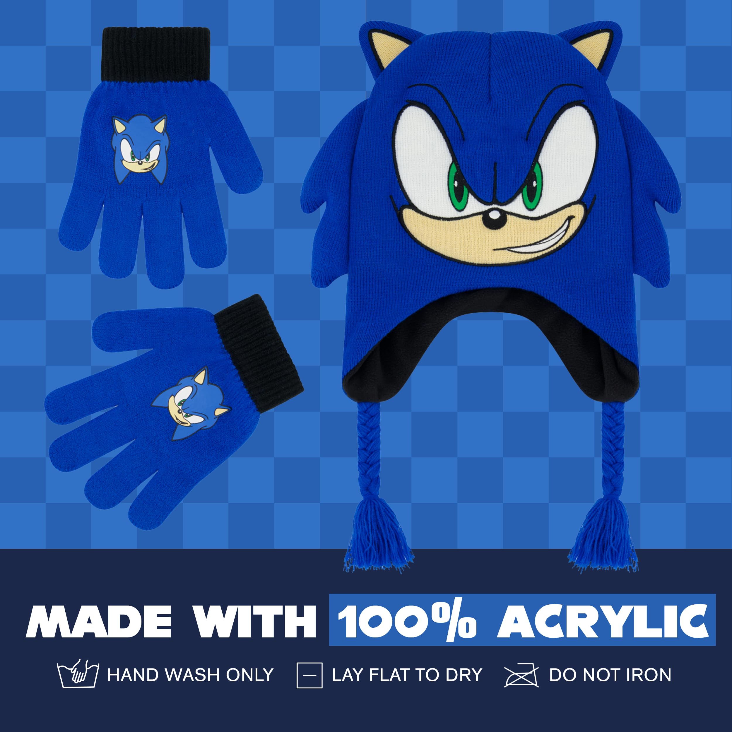 SONIC WINTER CAP AND GLOVE SET: Blue acrylic Peruvian style children's brimless cap with tassels and Sonic the Hedgehog face, ears and quills design, and two matching gloves with embroidered Sonic images on them