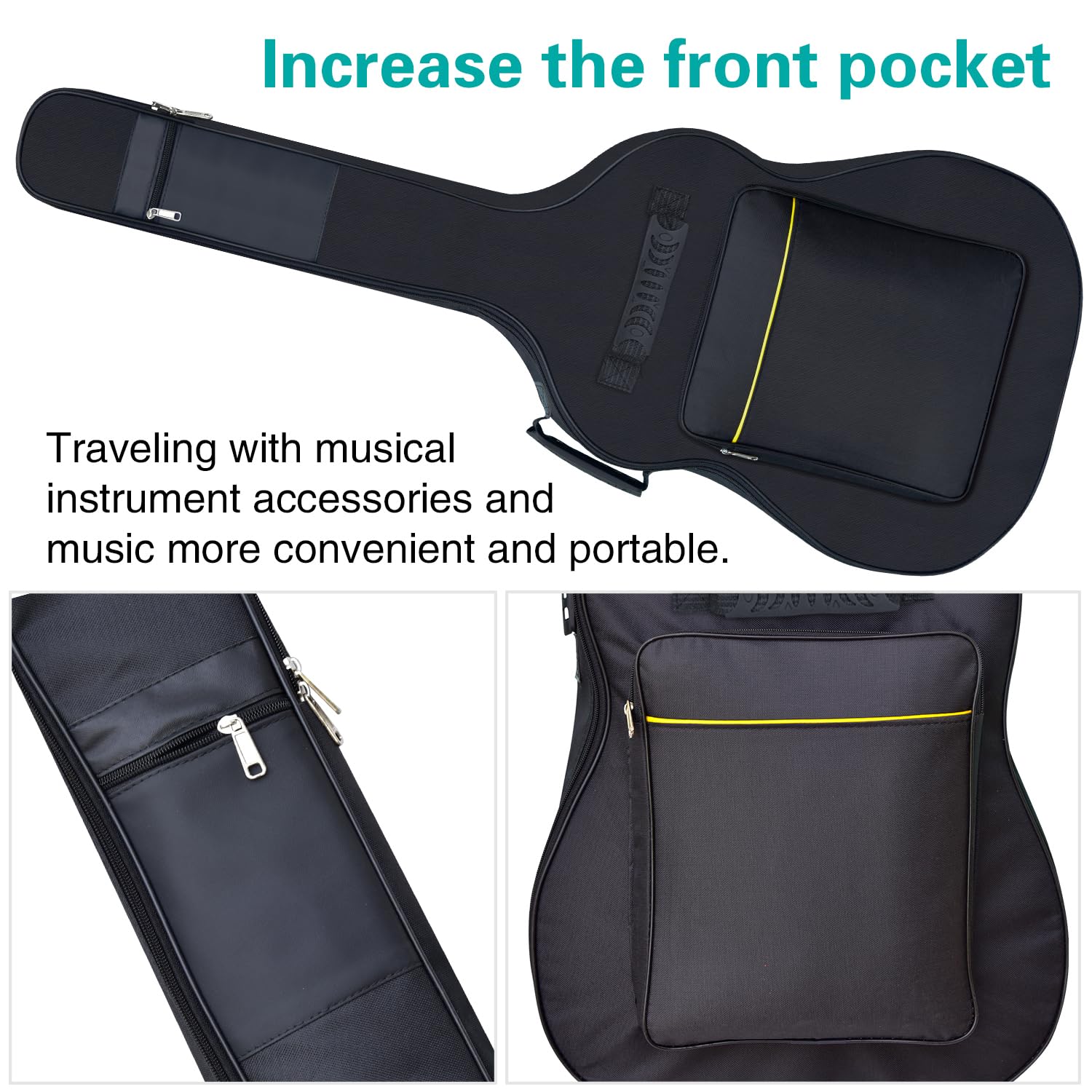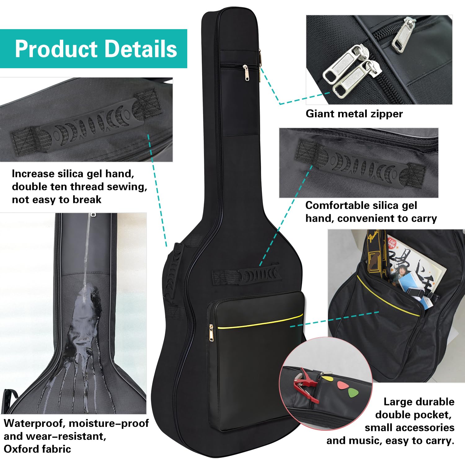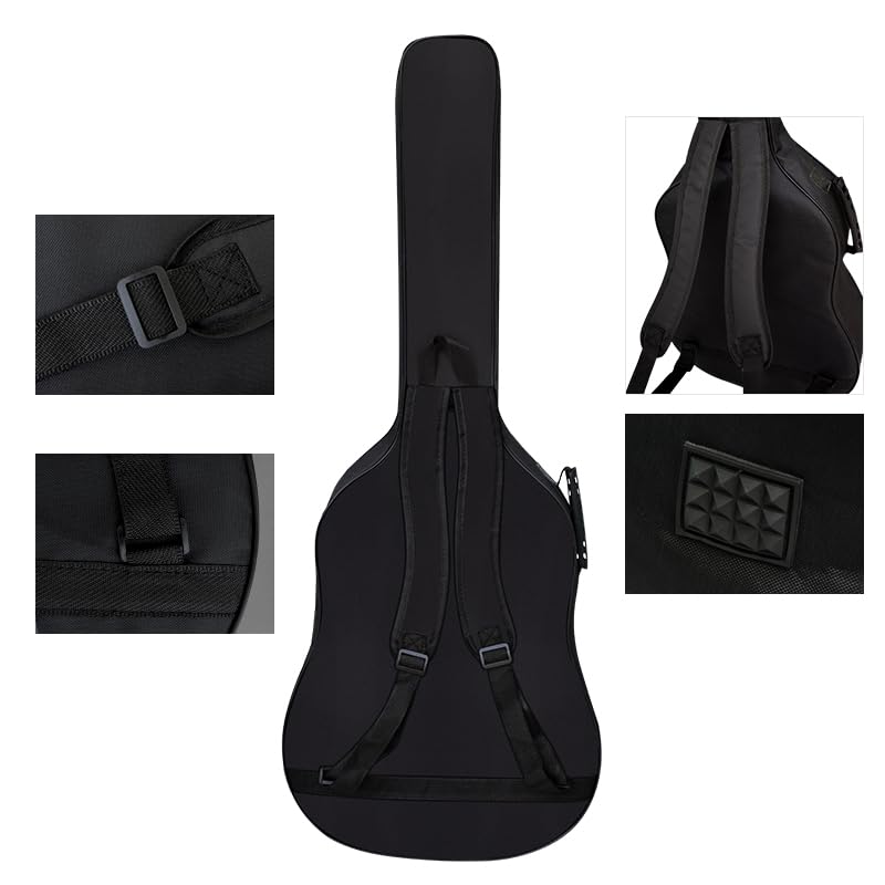 Size: The length of the guitar bag is 41 inches, the width is 16.5 inches, and the thickness is 4.8 inches. It is very suitable for 40 and 41 inch acoustic guitars. cumbersome compatible with 39/40/41 inch guitars.