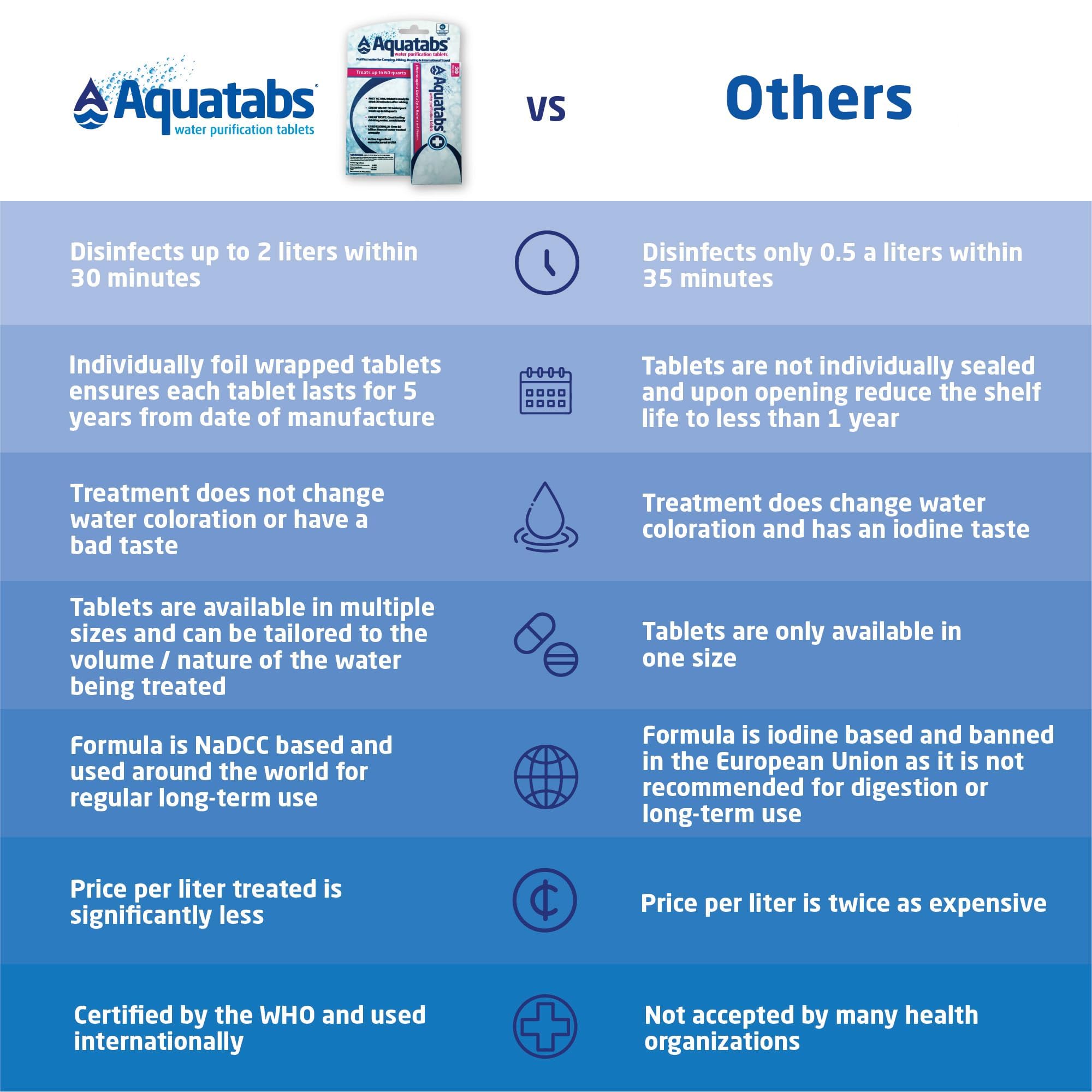 DRINKING WATER, ANYTIME, ANYWHERE - Aquatabs are the world's most popular tablet and the ultimate choice for portable water treatment tablets. Removes 99.9999% of Bacteria, 99.99% of Viruses, and 99.9% of Cysts (Giardia).