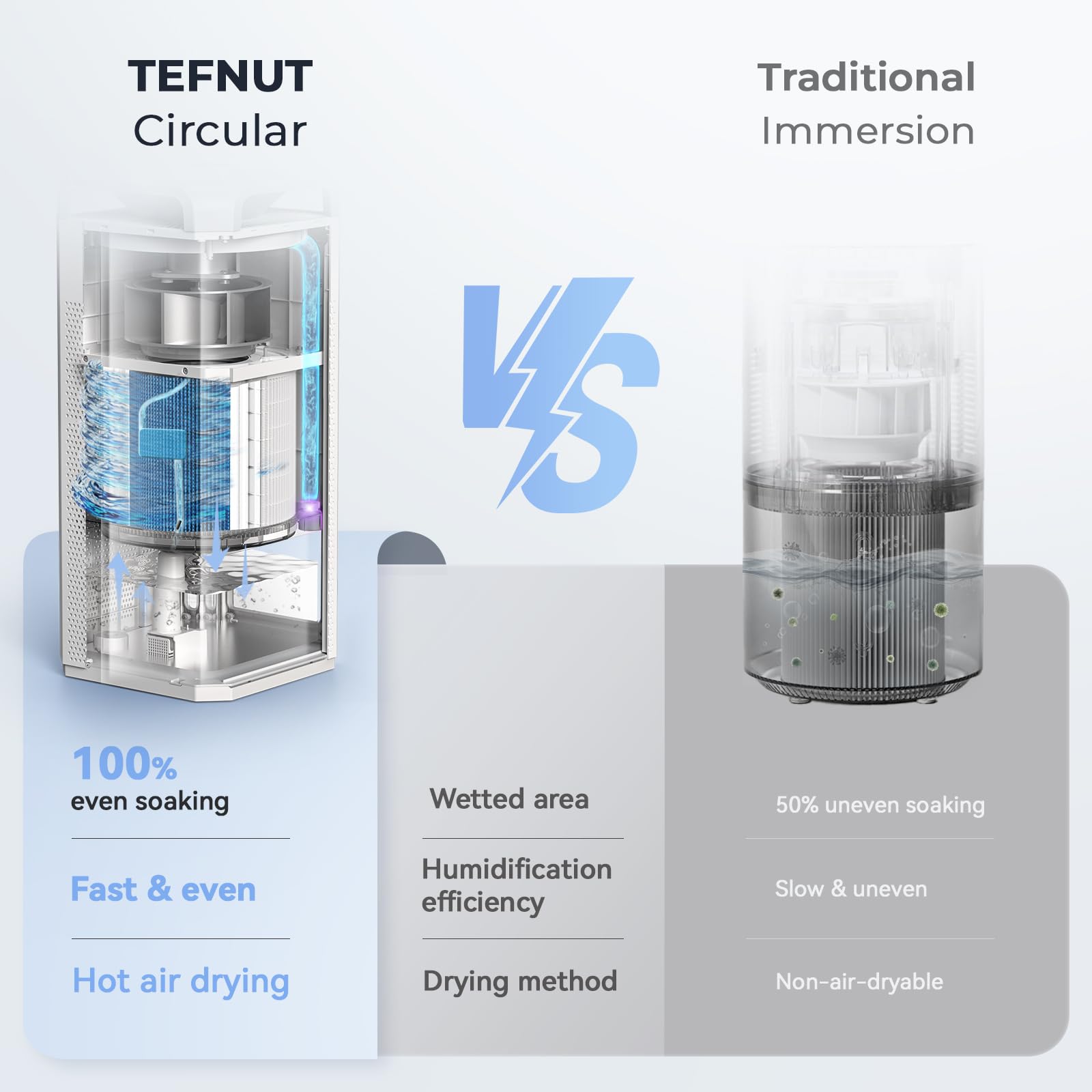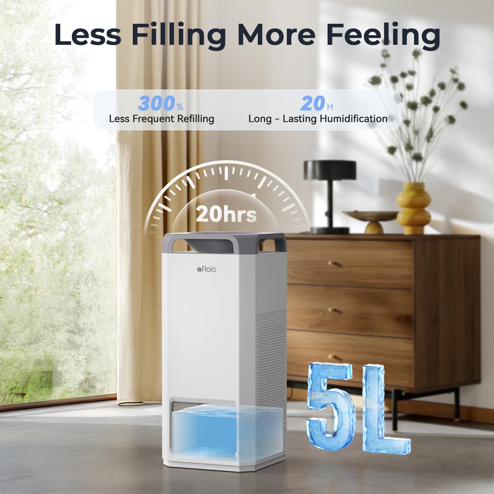 High-Capacity Humidification: 5L tank with 1000ml/h output for long-lasting moisture, reducing frequent refills. Top-fill design enables quick, spill-free refills with no bending or mess. Cold mist evaporation delivers ultra-even, "mist-free" humidification to avoid wet floors, keeping air hydrated for skin, sinuses, and plants.