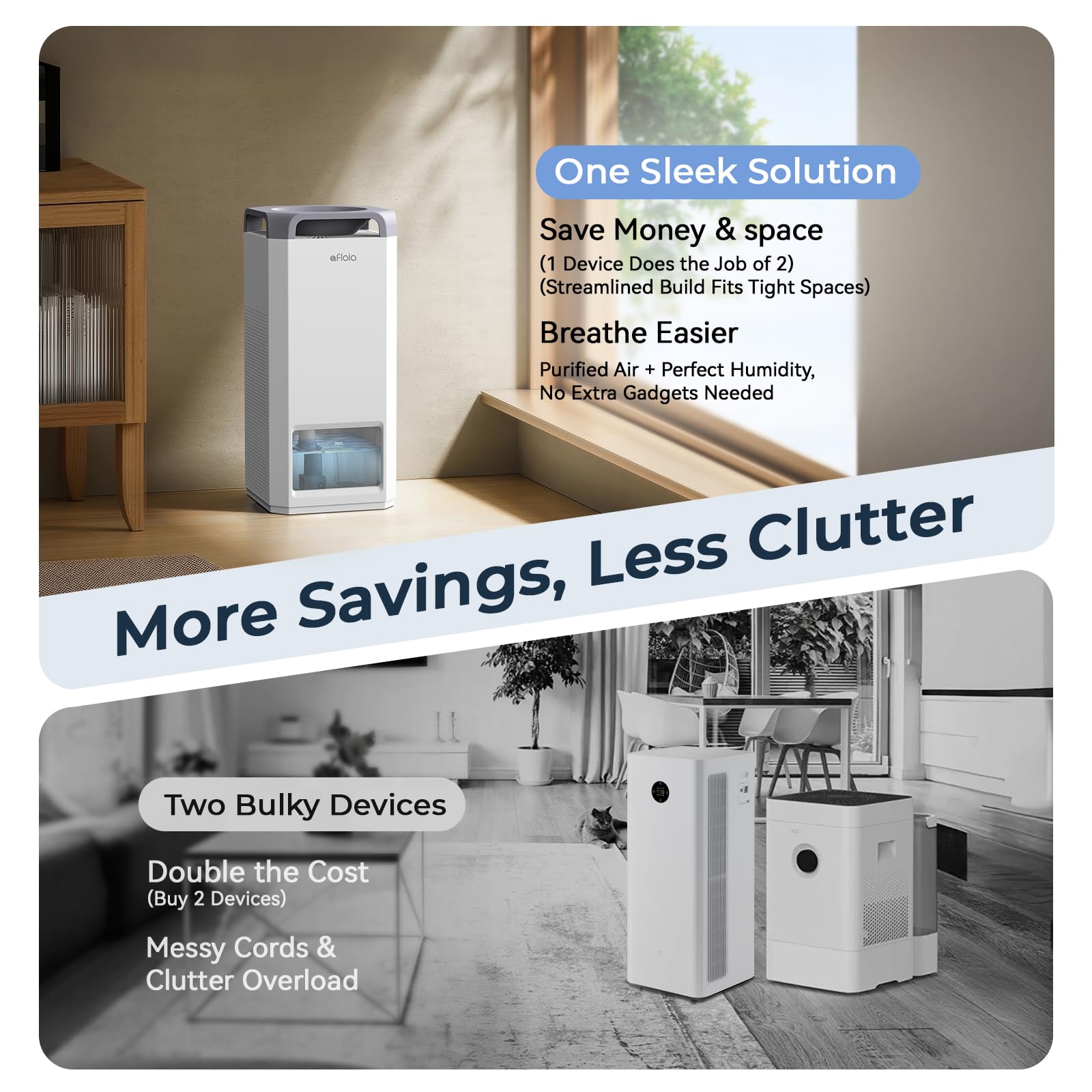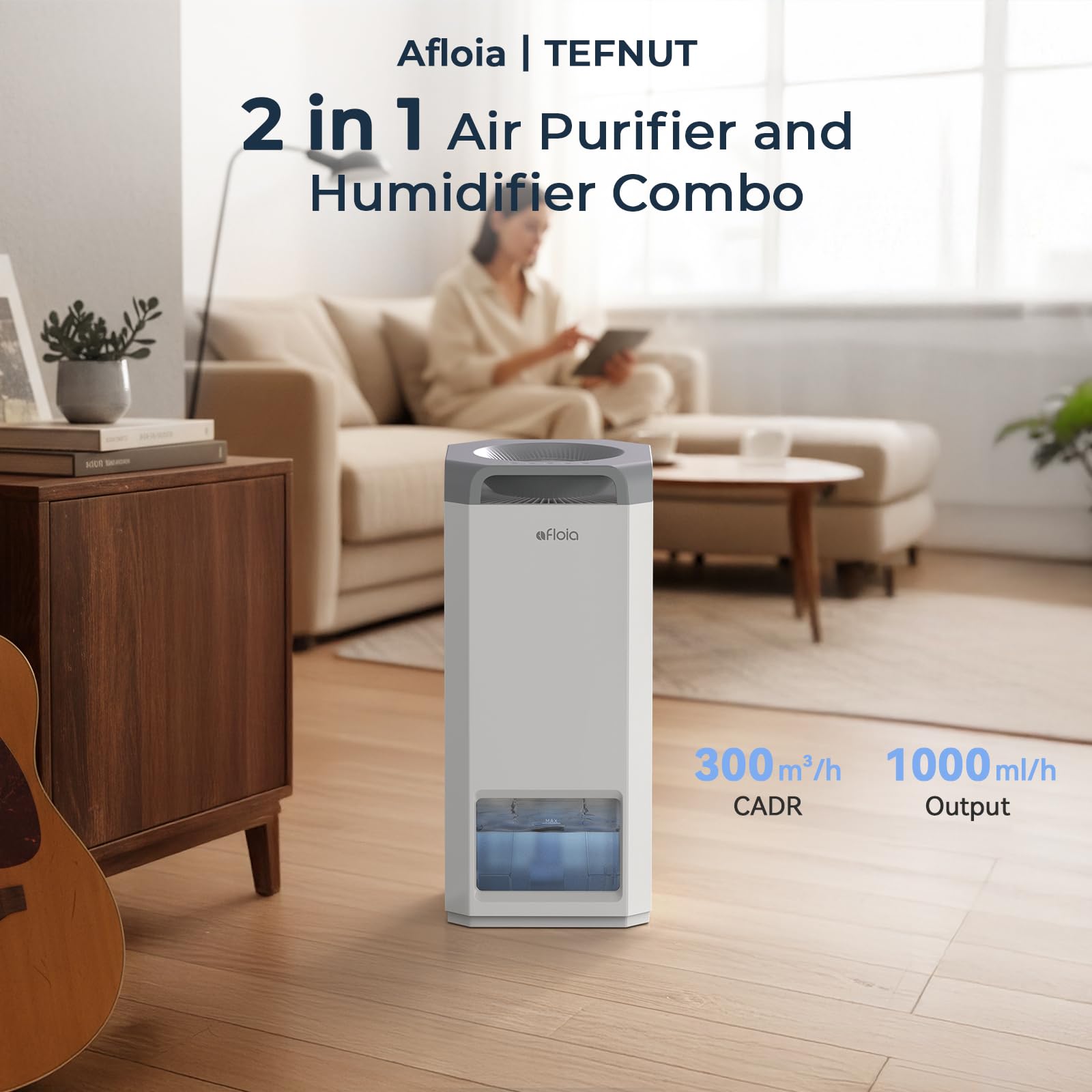 This air purifier and humidifier combo delivers 300m³/h CADR purification and 1000ml/h humidification.