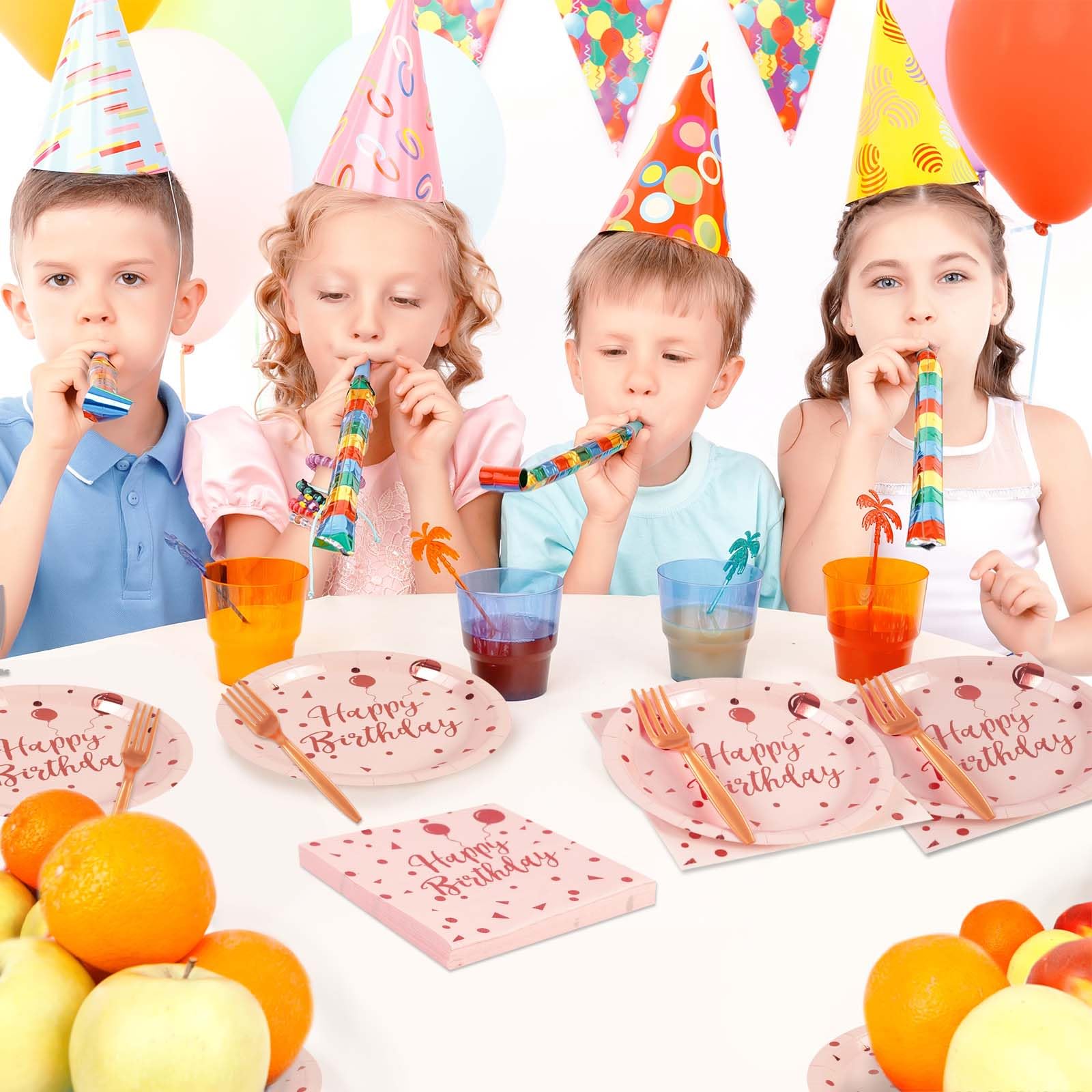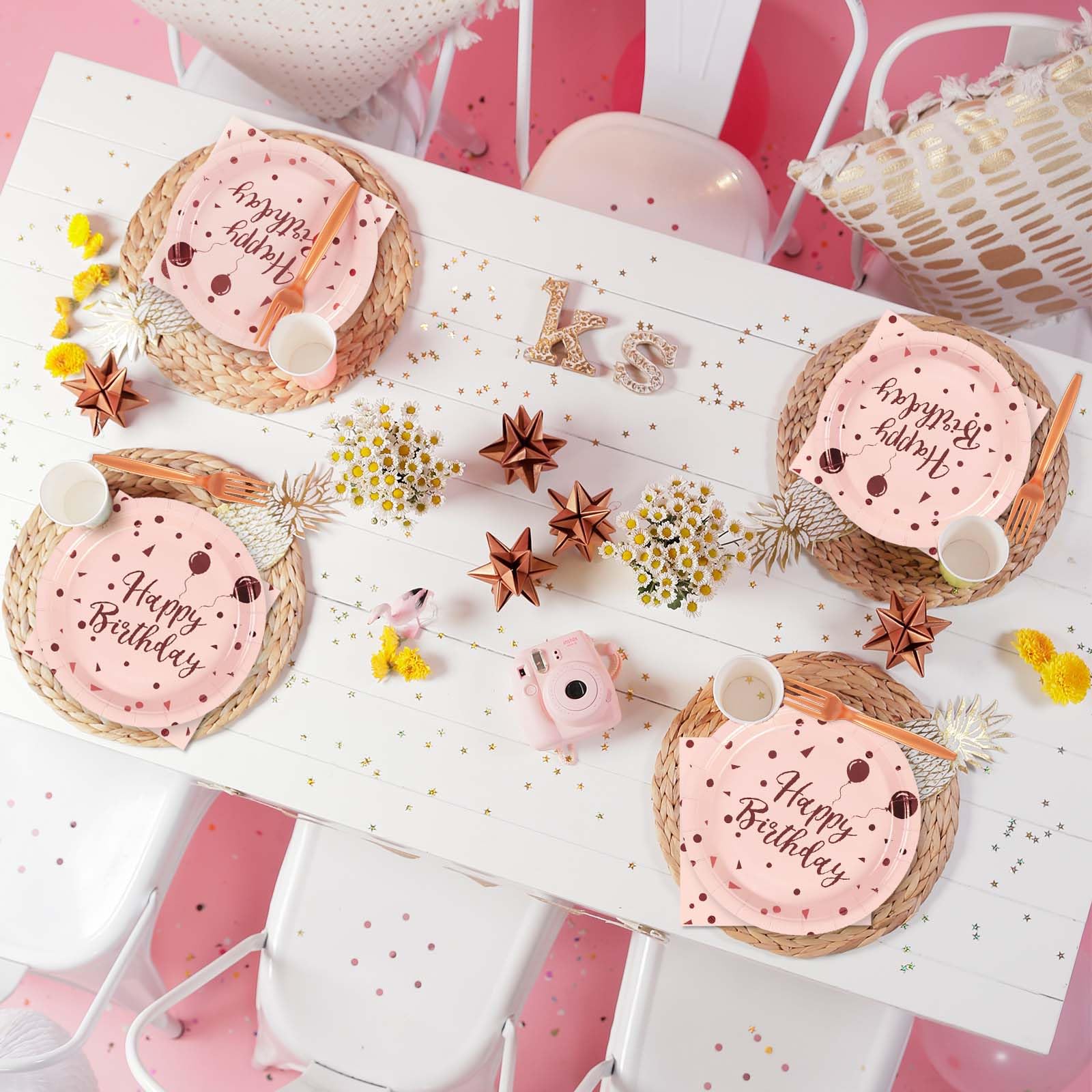 【STYLISH AND UNDERSTATED DESIGN】:The paper plates are rose in color and designed with golden happy birthday, gold foil dots and triangles and golden balloons. These classic design elements can make your party more elegant and stylish while dining, very aesthetically pleasing, and I'm sure your guests will really love this design!