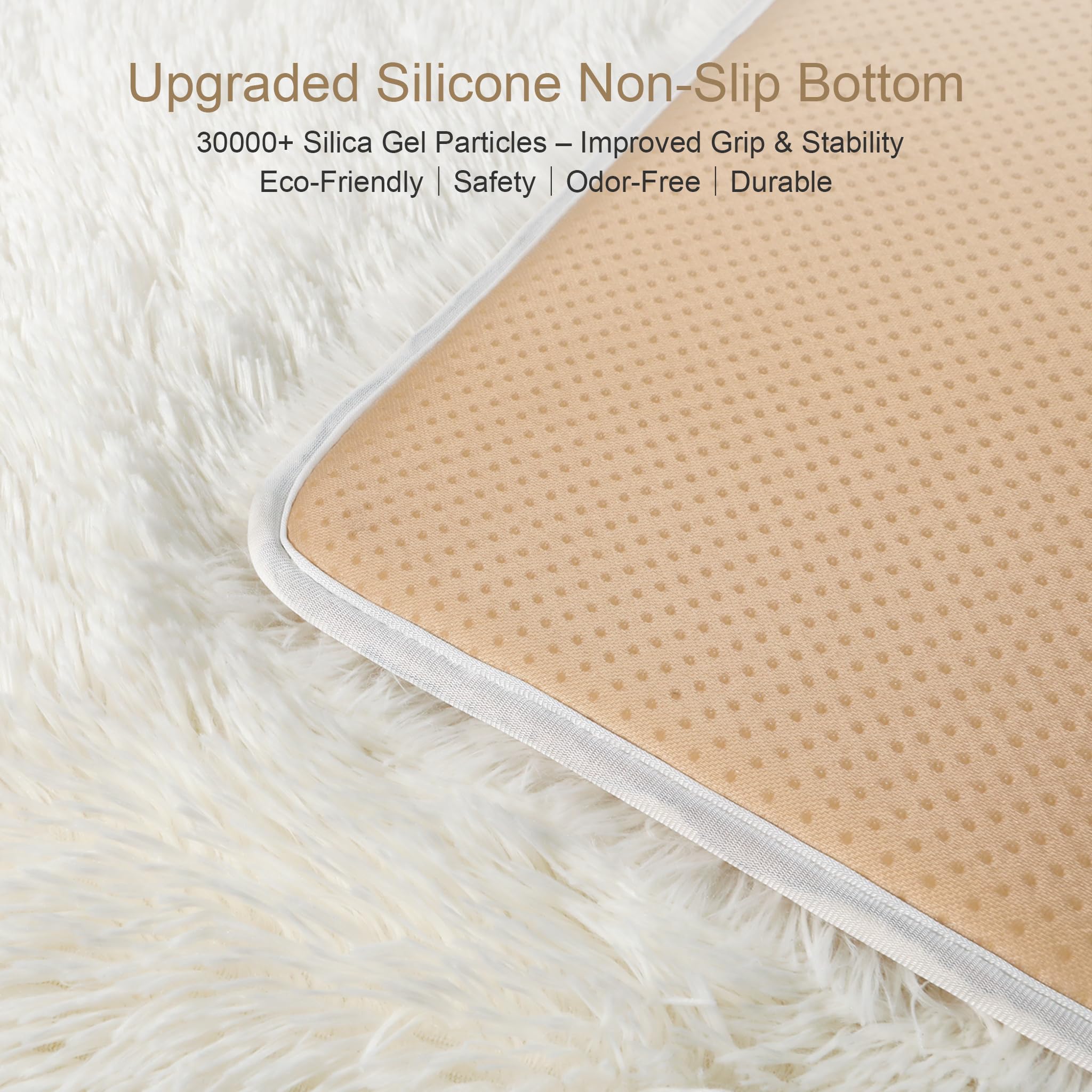 Upgraded Silicone Non-Slip Bottom: Designed for ultimate stability and comfort, this shaggy fuzzy rug features an upgraded silicone backing with 30,000+ grip particles, providing superior traction on hardwood, tile, vinyl, and laminate floors. Made from odor-free, skin-friendly materials, it ensures a safe and cozy space for kids. The durable and soft design provides long-lasting comfort. Perfect for bedrooms, nurseries, dorms, and play areas, this ultra-plush rug enhances any space with warmth and style.