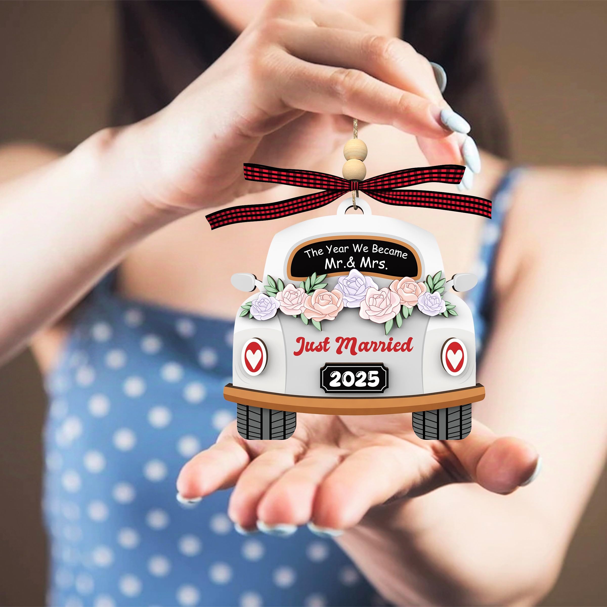 🚗PERFECT WEDDING ORNAMENT SIZE: Measures 3.9” (10 cm) with a slim 0.12” (0.3 cm) profile—eye-catching yet easy to store. Enhances Christmas trees, mantels, or floral decor with festive charm.