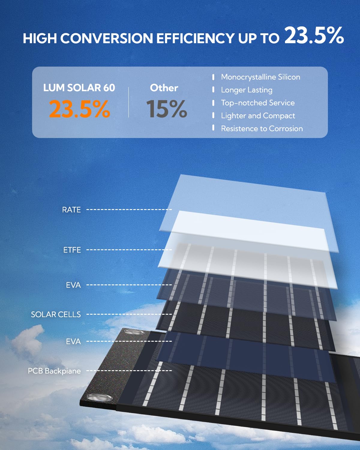 23.5% High Efficiency & Compression Resistant 176lb - Built with high-quality monocrystalline silicon, LUMOPAL folding solar panels offer a conversion rate of up to 23.5%, much higher compared to polycrystalline solar panels, effectively converting solar energy into electricity. When folded, the LUMOPAL solar panel can withstand pressures of up to 176lb, defying any bumps in your road, making it a great pal for outdoor trips.