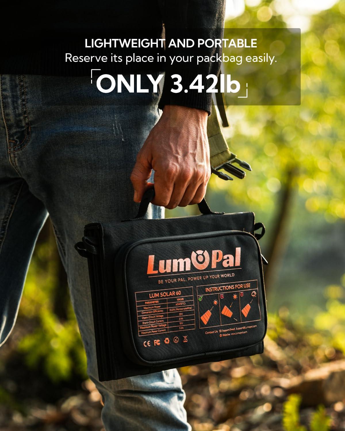 Foldable and Portable - The LUMOPAL solar panel kit is foldable and measures only 6.7*9.5in when folded, and weighs only 3.42lb, making it portable and lightweight enough to fit into any camping or travel backpack.