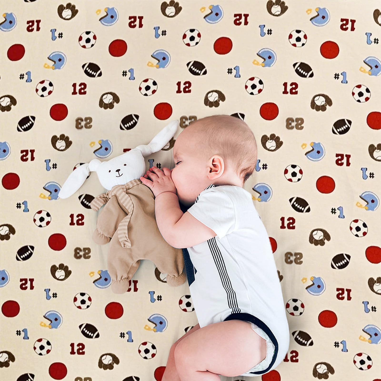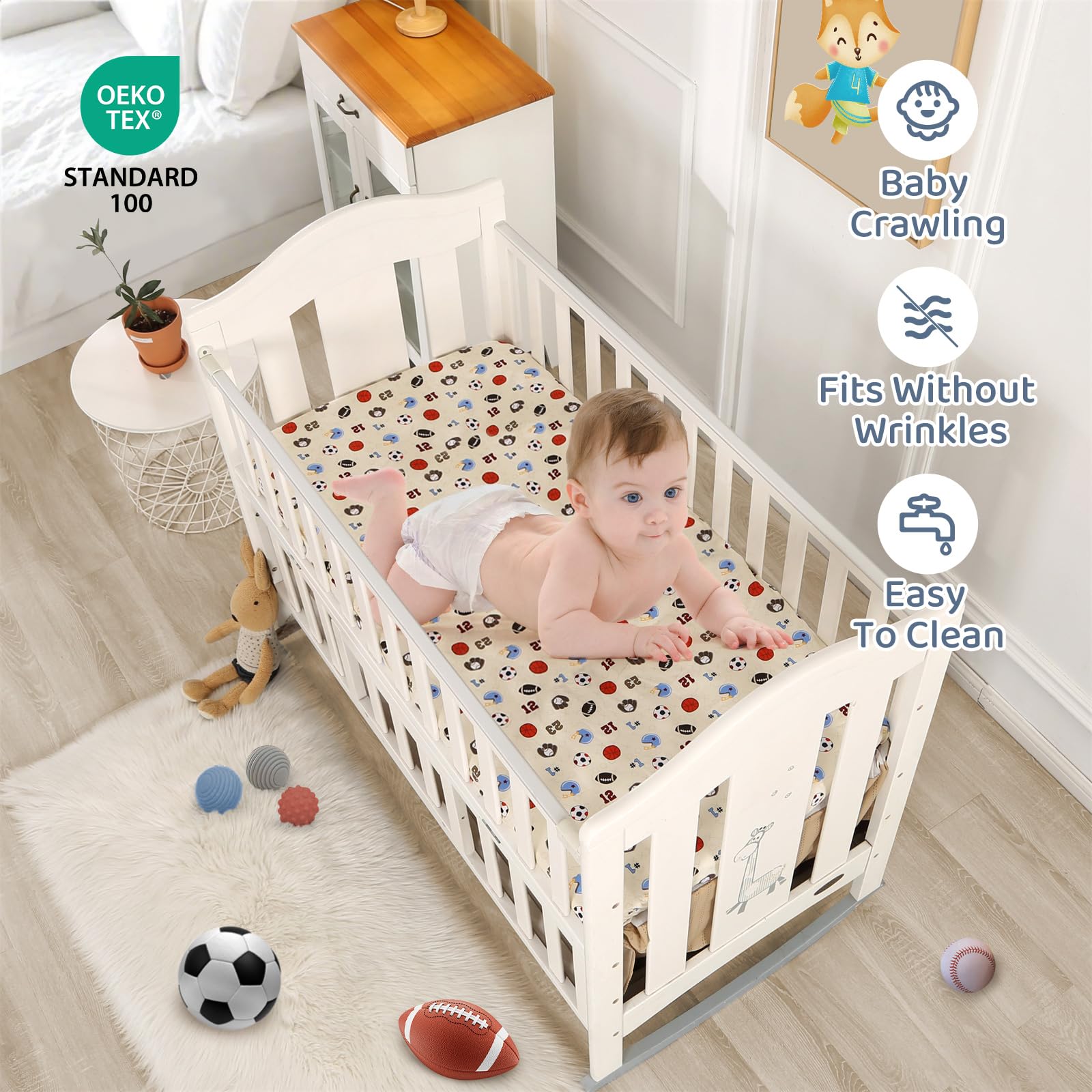 Nursery Bedding Design: Securely fitted crib sheets for mini cribs with all-around elastic and vibrant sports patterns make decorating the nursery bedding set easy and perfect for baby boys