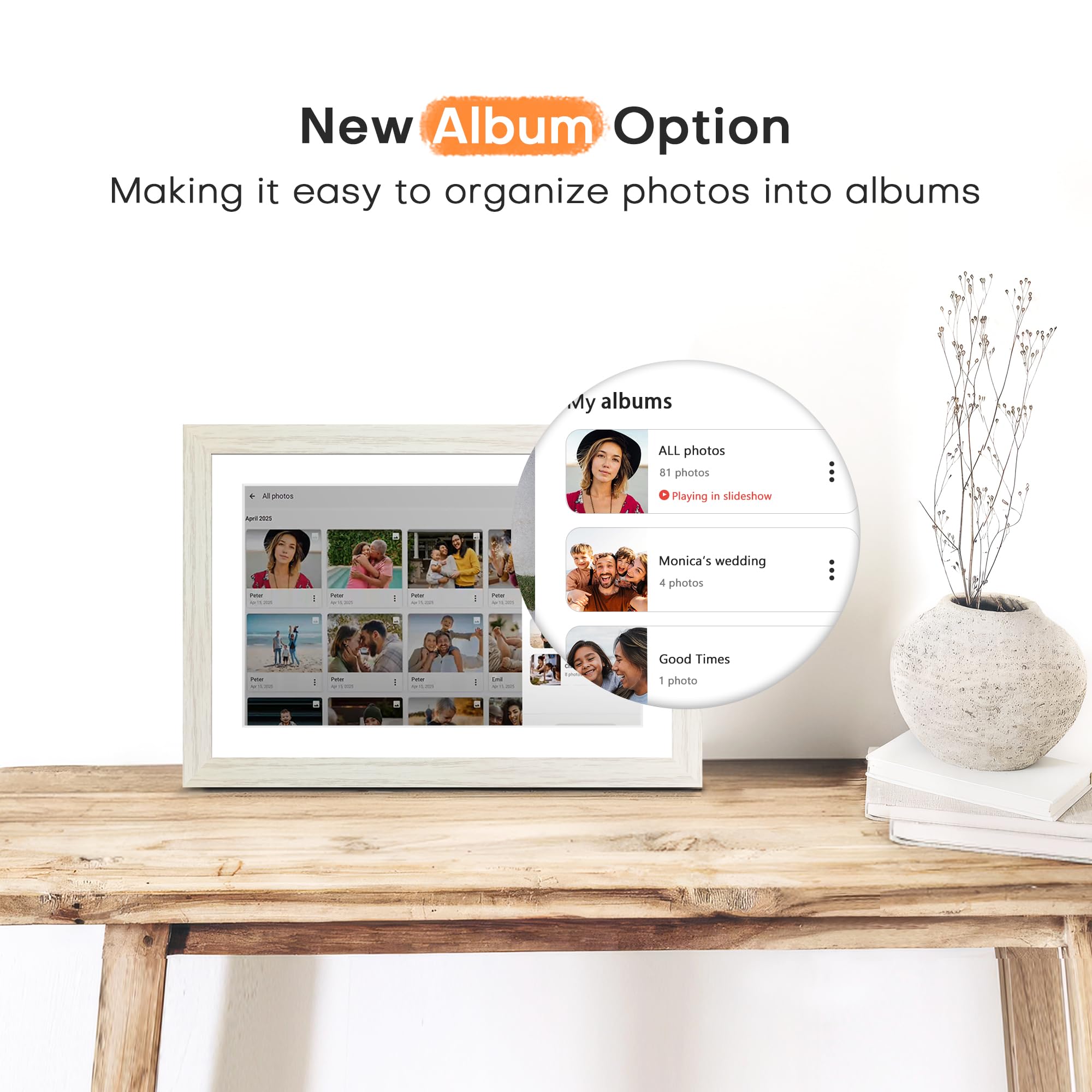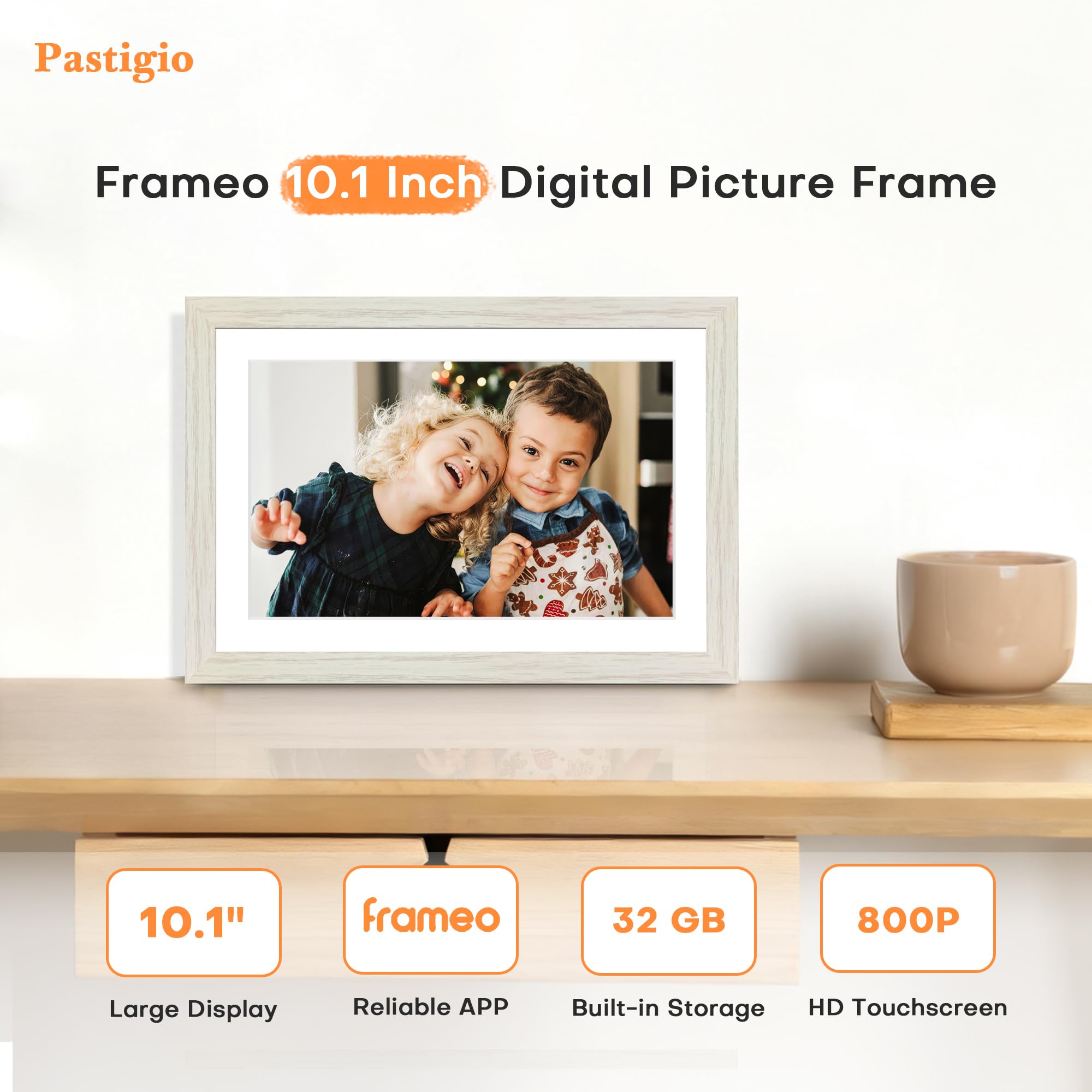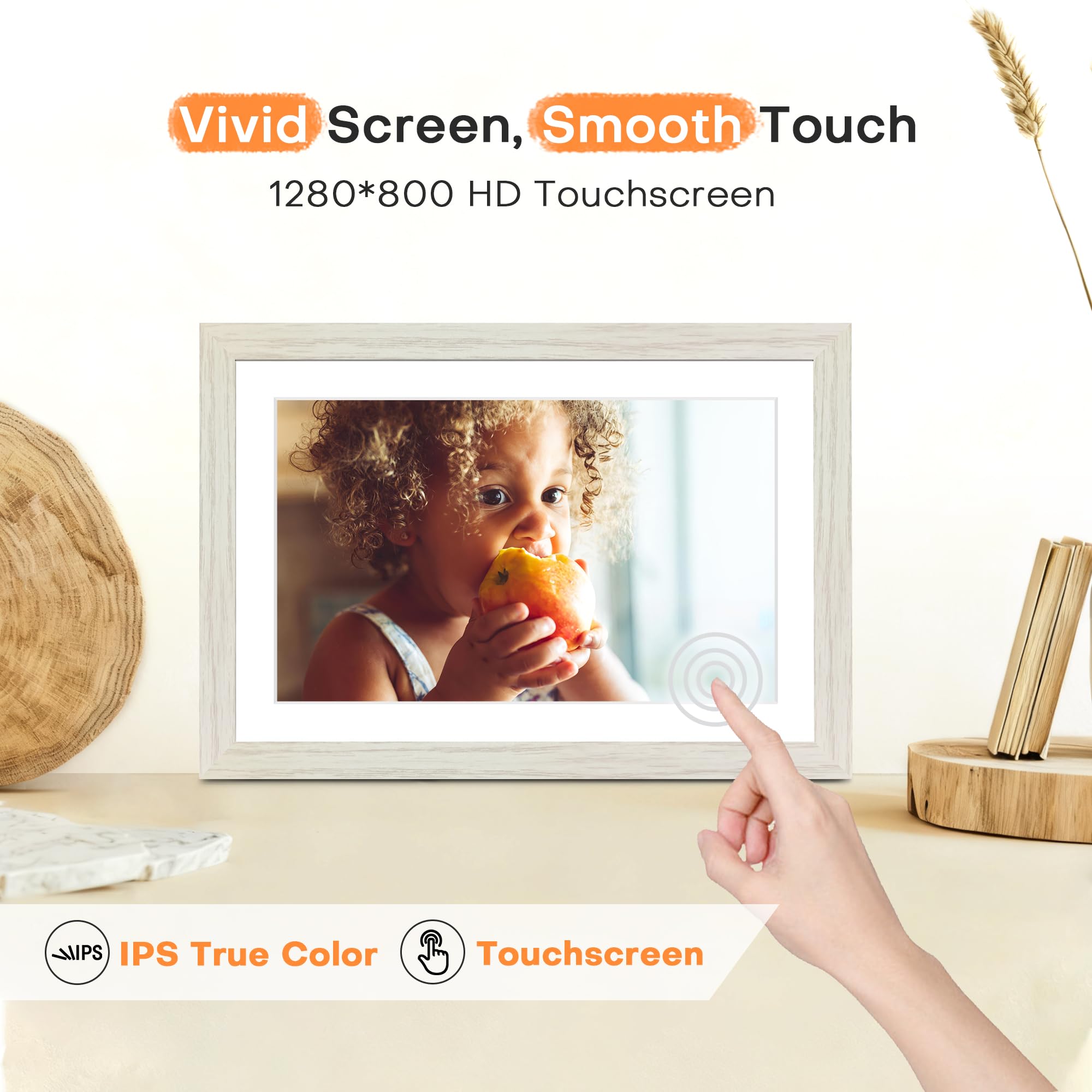 FHD IPS Touch Screen Display; Pastigio wifi picture frame equipped with a 10.1 inch digital panel with 1280*800 HD for vivid color and exquisite details. Border design with neutral tone complements a wide range of interior styles. Through this rotating picture frame, You can see the furry hair of your lovely pet, see the youthful freckles on smiley faces, see how every teeny tiny detail builds up your colorful life. Multiple image formats are supported, JPG/JPEG/BMP/PNG, and video format by MP4