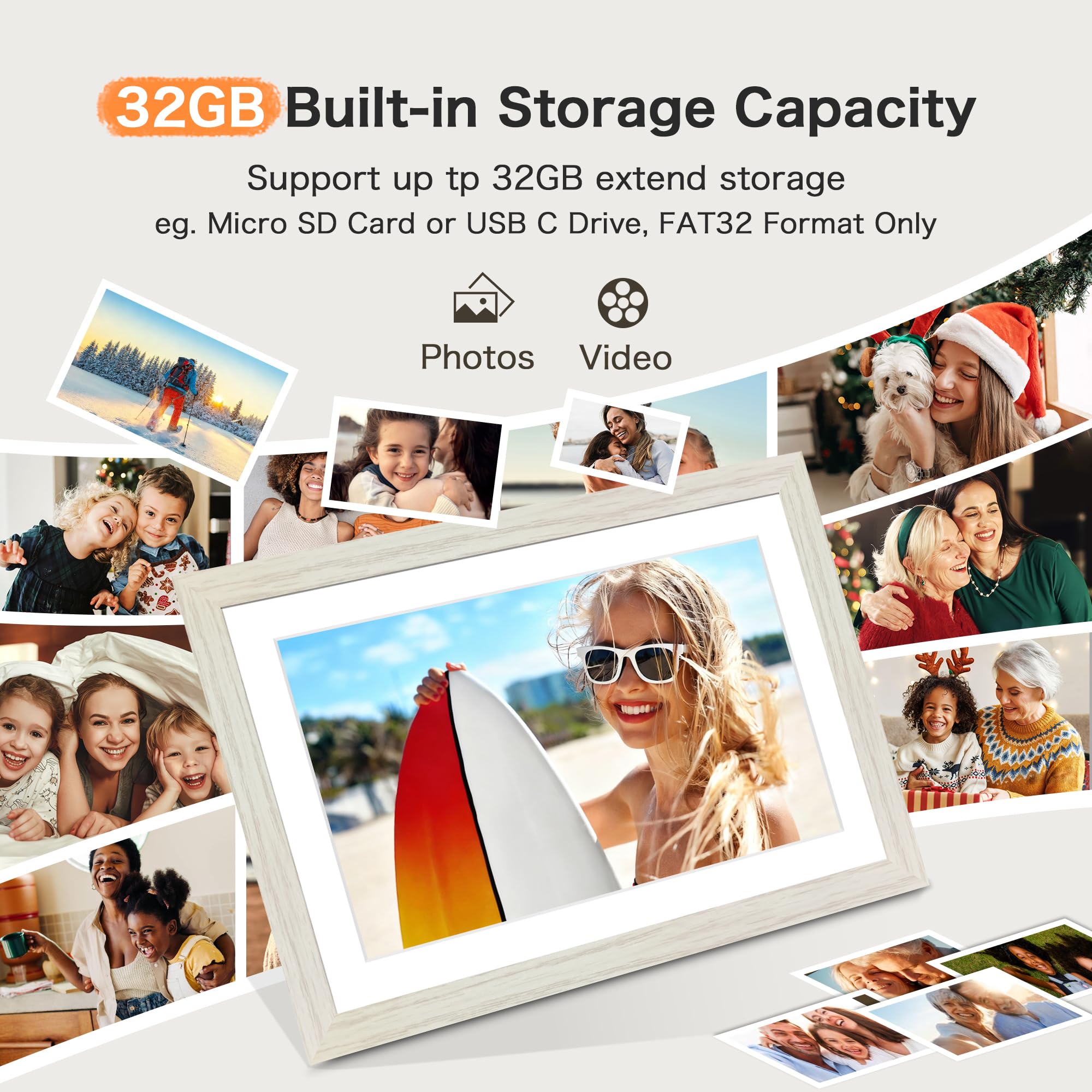 Instant Share via Frameo APP; Connect your digital picture frame to WIFI, and share photos and videos(Max.15s) quickly via a reliable App- Frameo to our digital photo frame from anywhere, privately and safely, no member numbers limited. Compatible with Frameo APP, no extra app needed. Our electronic picture frame slideshow has 32GB built-in memory and support up to 32GB external storage, enables you to share 50,000+ photos. Also, you can transfer via external storage or through a computer, no Wi-Fi needed