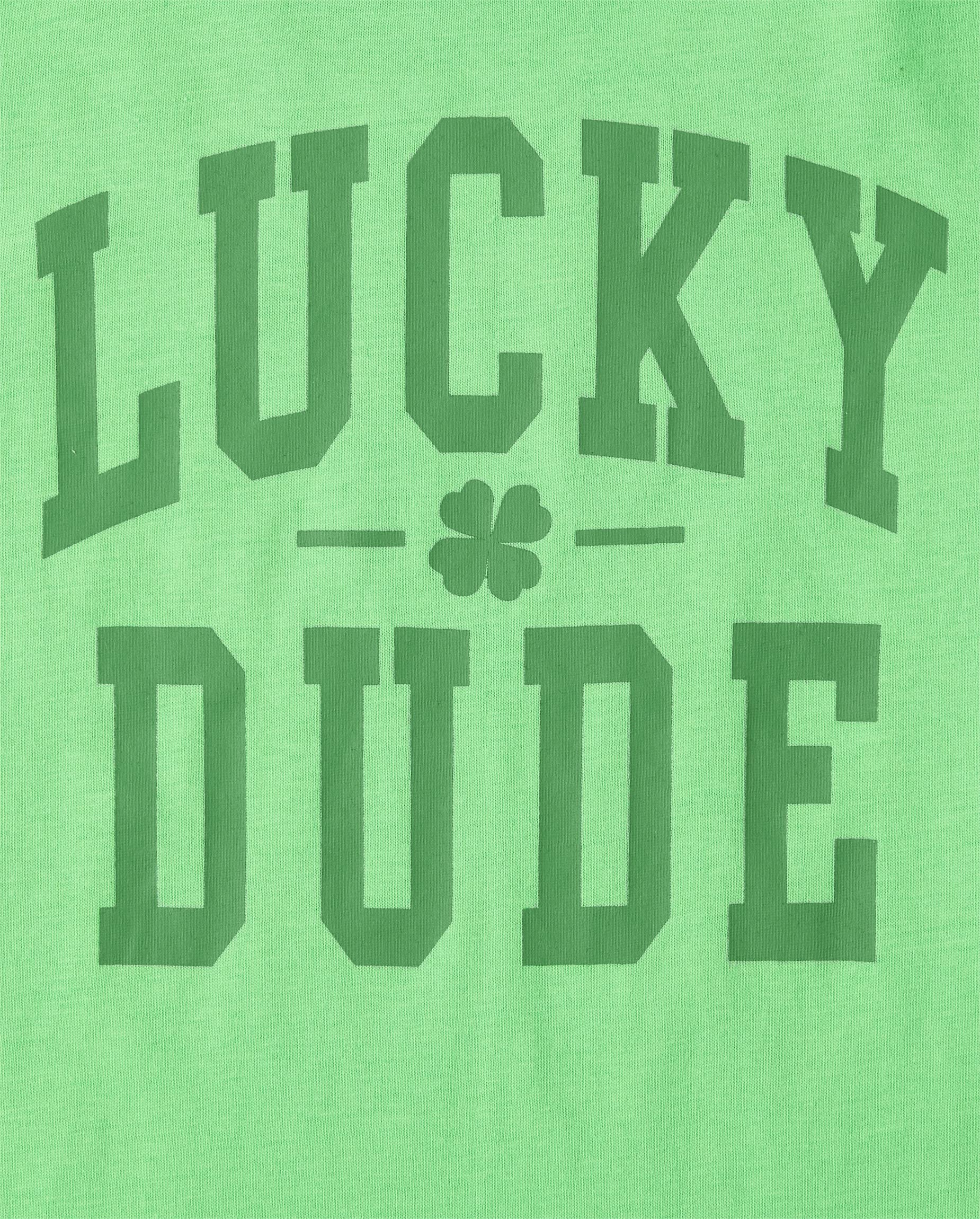DESIGN — Features short sleeves, rib-knit crew neck and 'Lucky Dude' graphic design at front