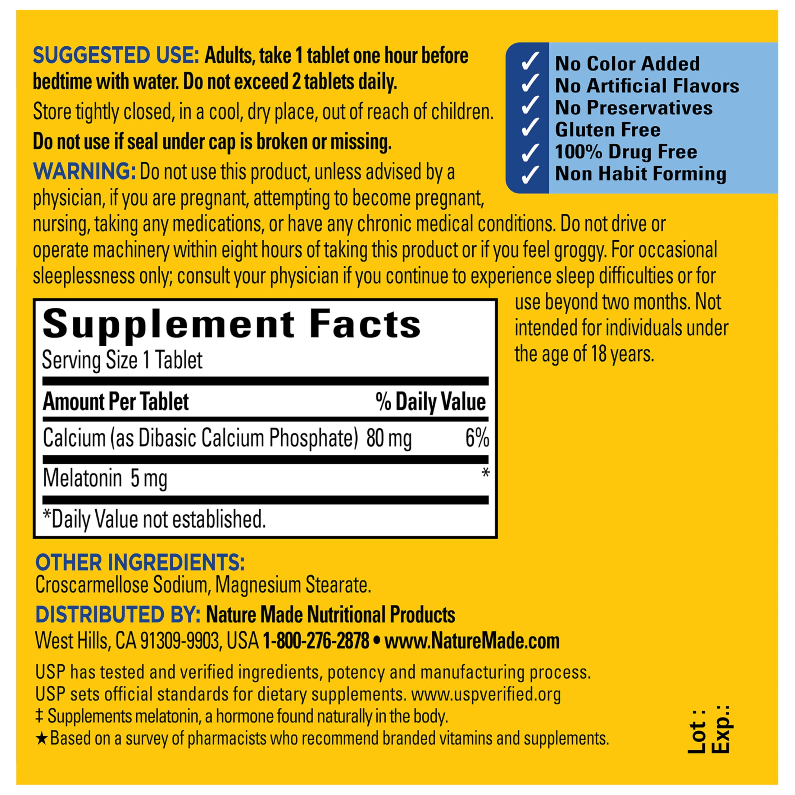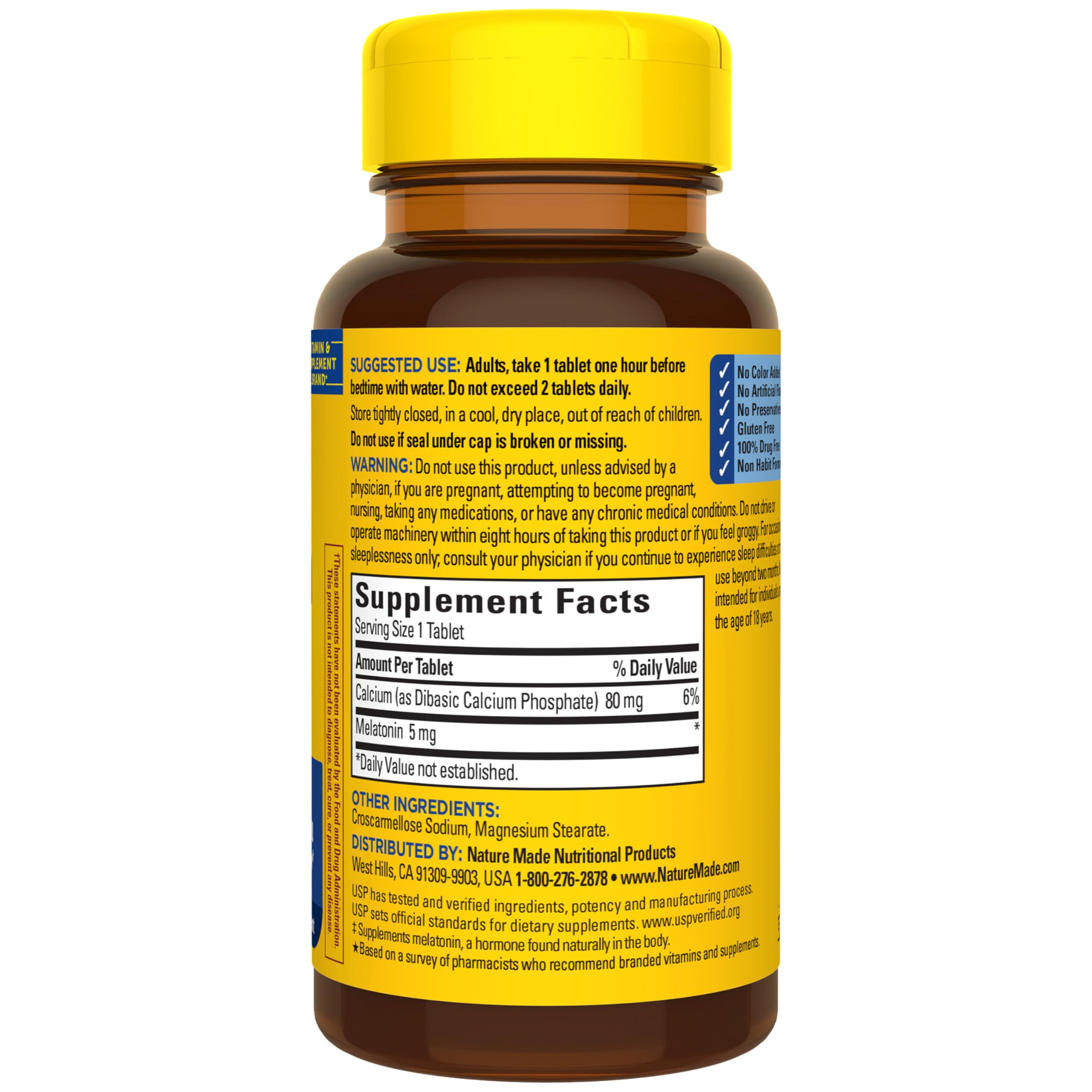 Product Description Nature Made Melatonin 5mg Extra Strength is a Melatonin sleep supplement designed to help you fall asleep faster and support restful sleep. Sourced from high-quality ingredients and 100% drug free, these gluten free Melatonin supplements have no color added, no artificial flavors, no preservatives, and are non habit forming. This Nature Made sleep supplement is specially formulated as a sleep aid for healthy adults to provide occasional sleep support. Adults take one Melatonin supplement tablet containing Melatonin 5 mg one hour before bedtime with water and do not exceed 2 tablets daily. With Nature Made occasional sleep aids, a good tomorrow starts tonight. USP has tested and verified ingredients, potency and manufacturing process. USP sets official standards for dietary supplements. Visit the USP verified website for more information. *Based on a survey of pharmacists who recommend branded vitamins and supplements. These statements have not been evaluated by the Food and Drug Administration. This product is not intended to diagnose, treat, cure or prevent any disease. Brand Story By Nature Made