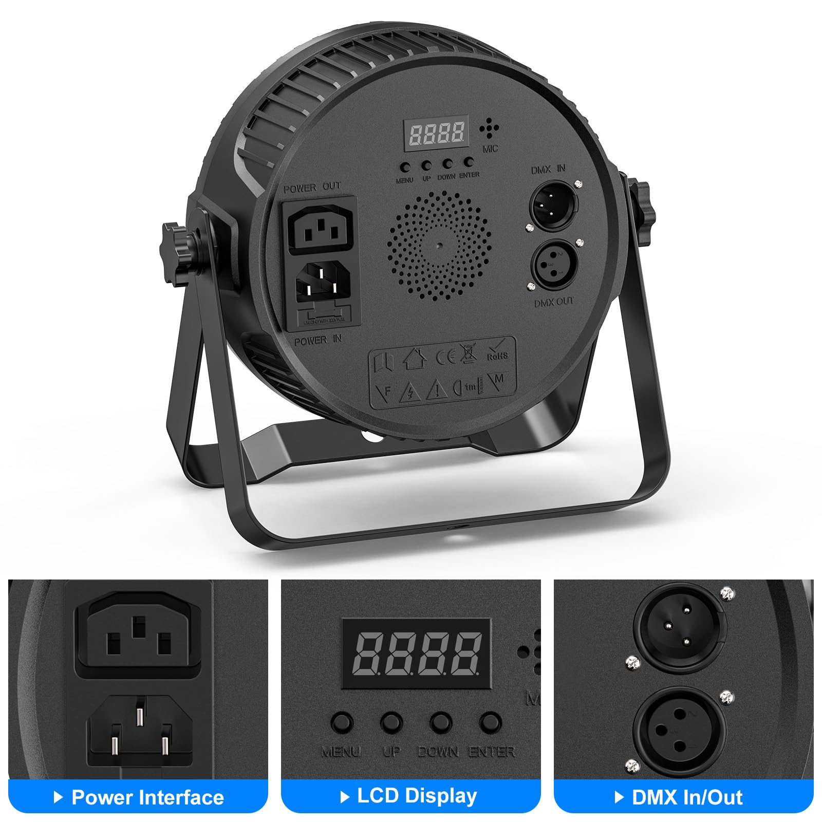 Par Lights Professional Features: 2 DMX modes (4/8 channel), 7 operational modes (sound control, automatic, master-slave, jump, strobe, gradient, color selection), 4 selectable dimming modes, and a 4-Button DMX menu with digital display, it is intuitively designed to make setup and alteration of operating parameters extremely quick and easy
