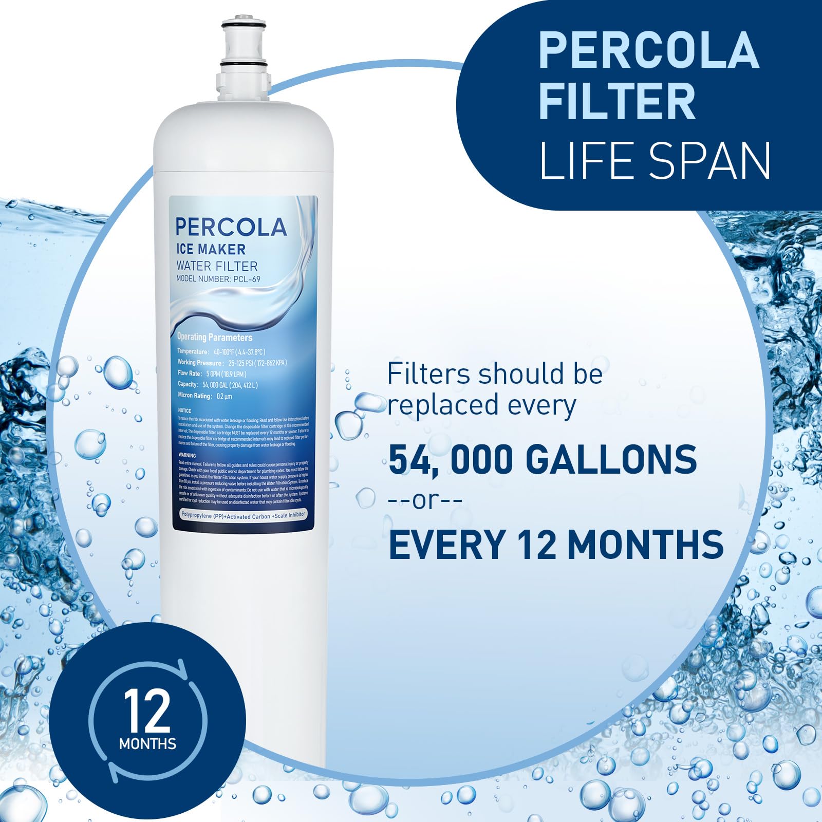 Replace filter every 54, 000 gallons or 6-12 months (whichever comes first).