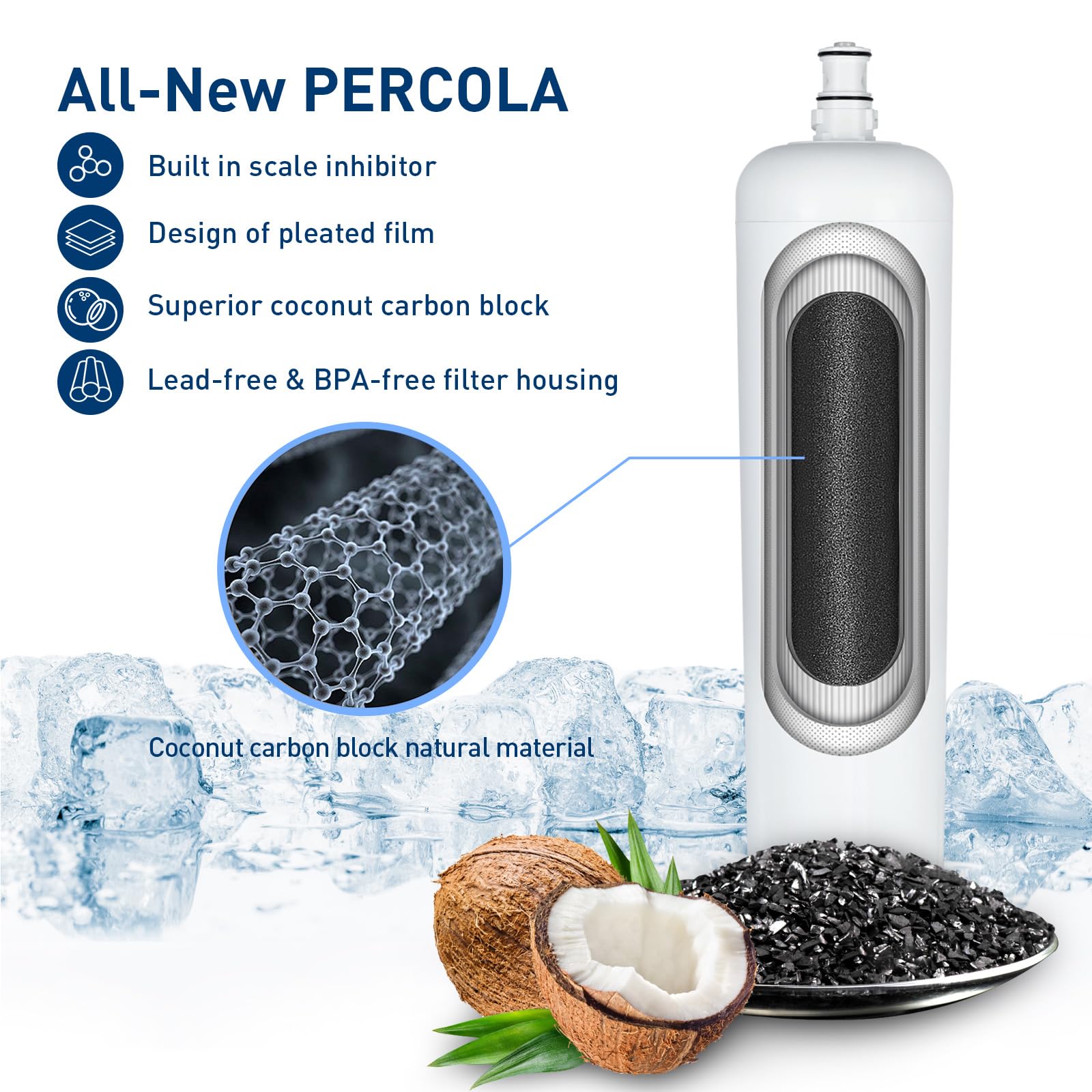 Equipped with triple filtration. The first stage captures larger particles with non-woven filter paper, the second stage reduces particles as small as 0.2 microns with a sub-micron pleated membrane, and finally a carbon block reduces chlorine taste and odor.