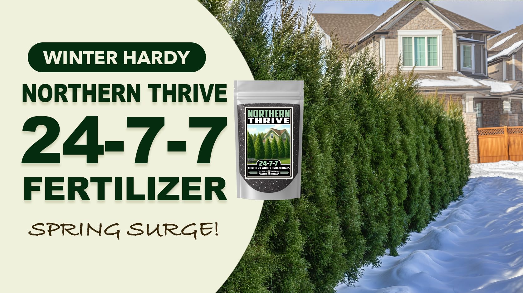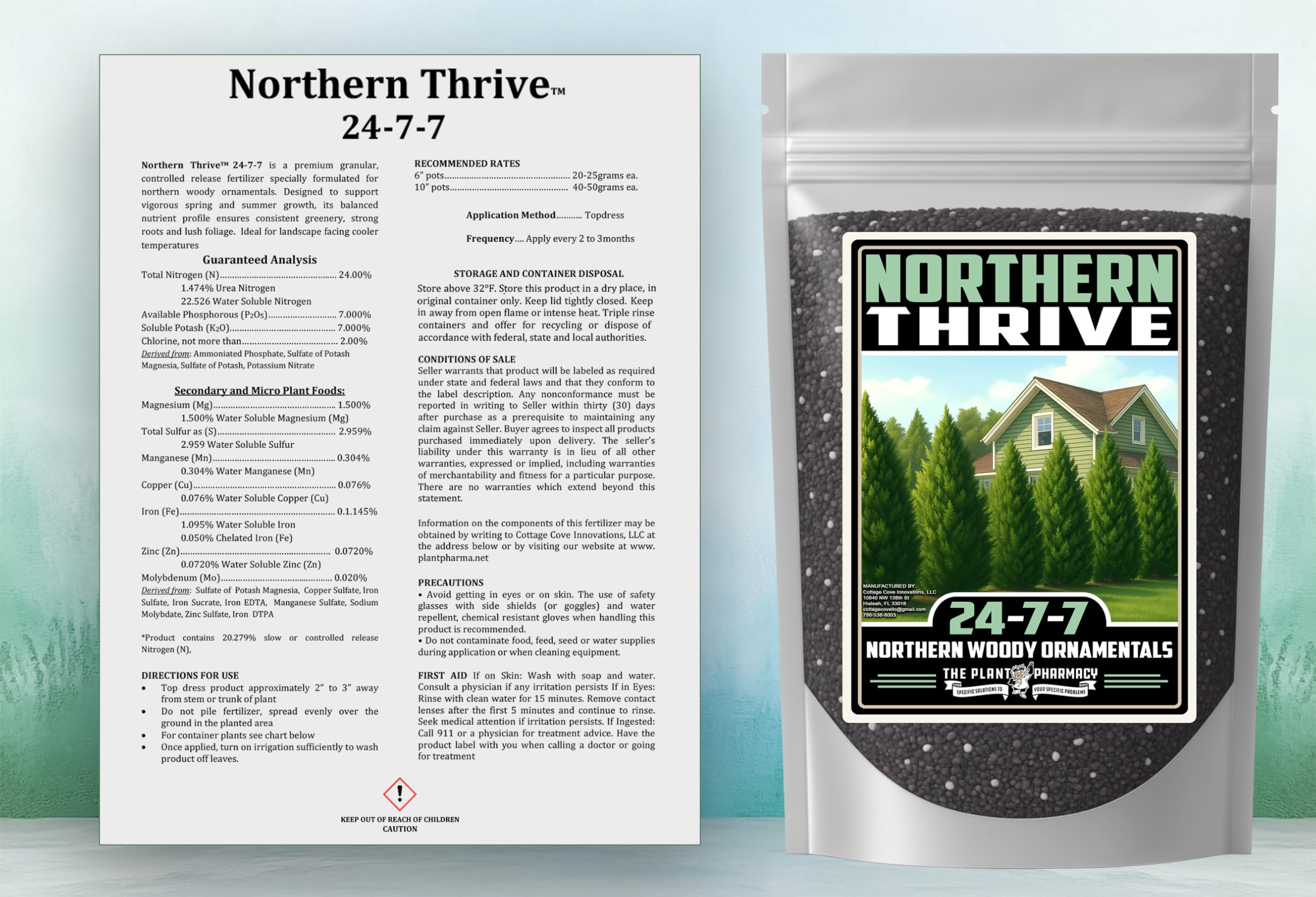 Northern Thrive 24-7-7 is a premium granular fertilizer formulated for northern woody ornamentals and landscape plants. With 24% total nitrogen, including slow-release and water-soluble forms, this formula promotes sustained spring and summer growth, deep green color, and strong root structure. The balanced NPK profile supports both foliage development and long-lasting plant health in colder climates. Also contains sulfur, magnesium, iron, manganese, copper, and zinc to enhance nutrient availability. Ideal for foundation plantings, borders, and containers, Northern Thrive can be top-dressed and watered in during the growing season. Apply every 2 to 3 months for optimal performance. Do not pile fertilizer at the base of plants—spread evenly in the root zone. Northern Thrive provides a consistent nutrient release pattern that complements landscape maintenance programs. Use according to best management practices and local fertilizer guidelines