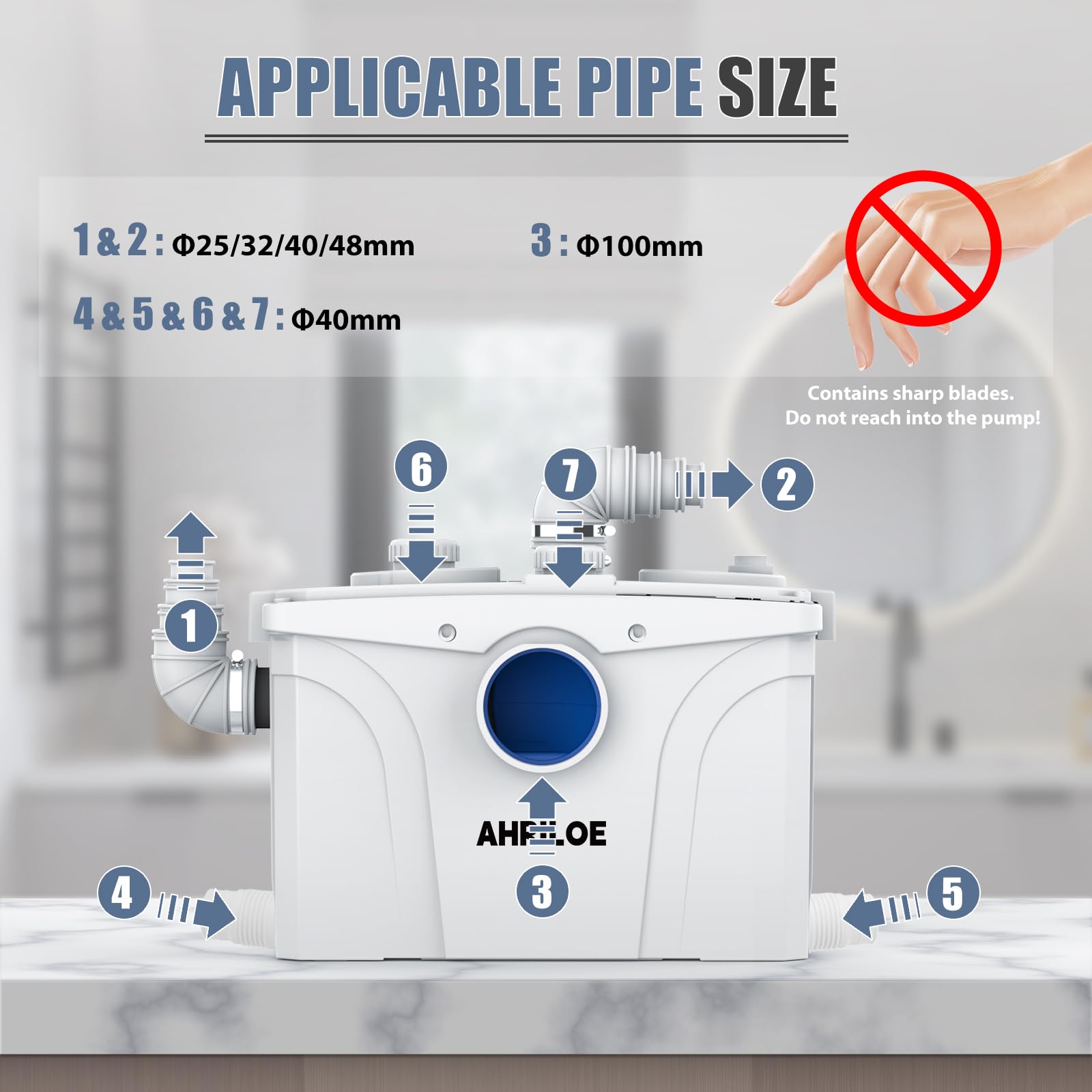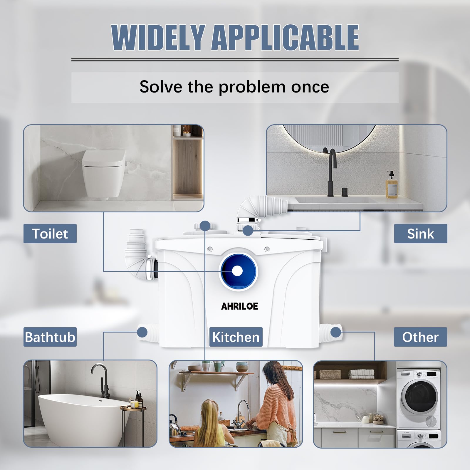 2 Outlets & 5 Inlets: Featuring top and side outlets, this sewage pump offers flexibility in installation. It also boasts 5 inlets to connect to sinks, washing machines, and bathtubs simultaneously, reducing wait time and enhancing your daily life.