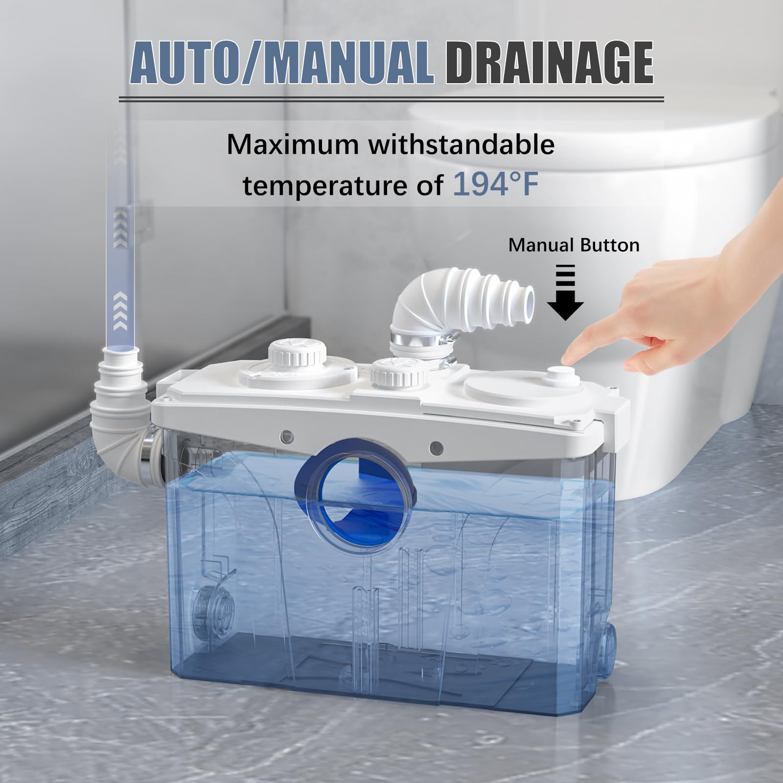 Automatic Drain & Delay Feature: This toilet pump comes with automatic and manual drainage functions that kick in when water levels hit a certain point. A manual button allows for drainage tests. The upgraded model has a time delay, so the pump doesn't kick in too often and it runs super quietly, under 45 decibels, so it won't disturb your day.