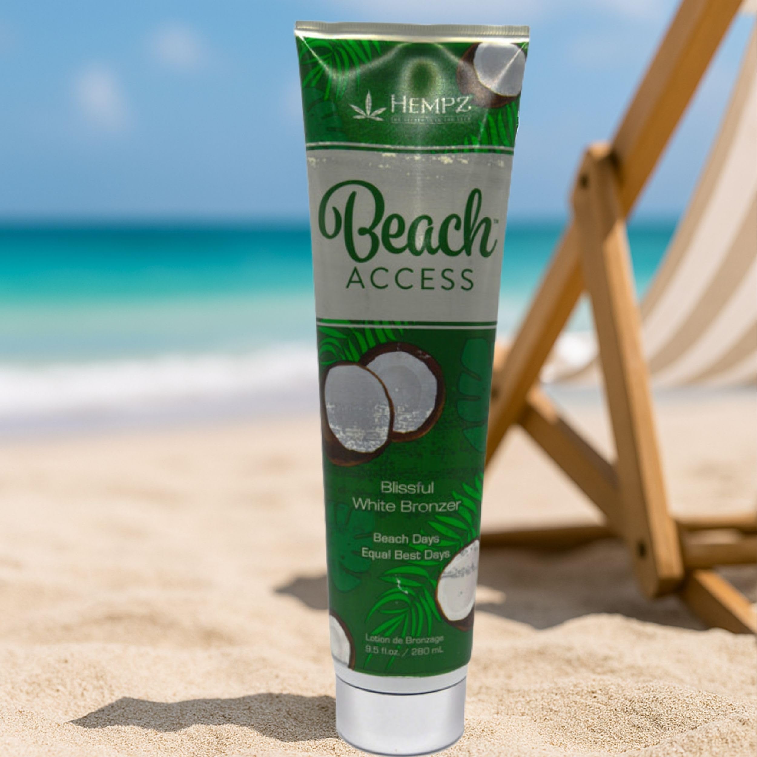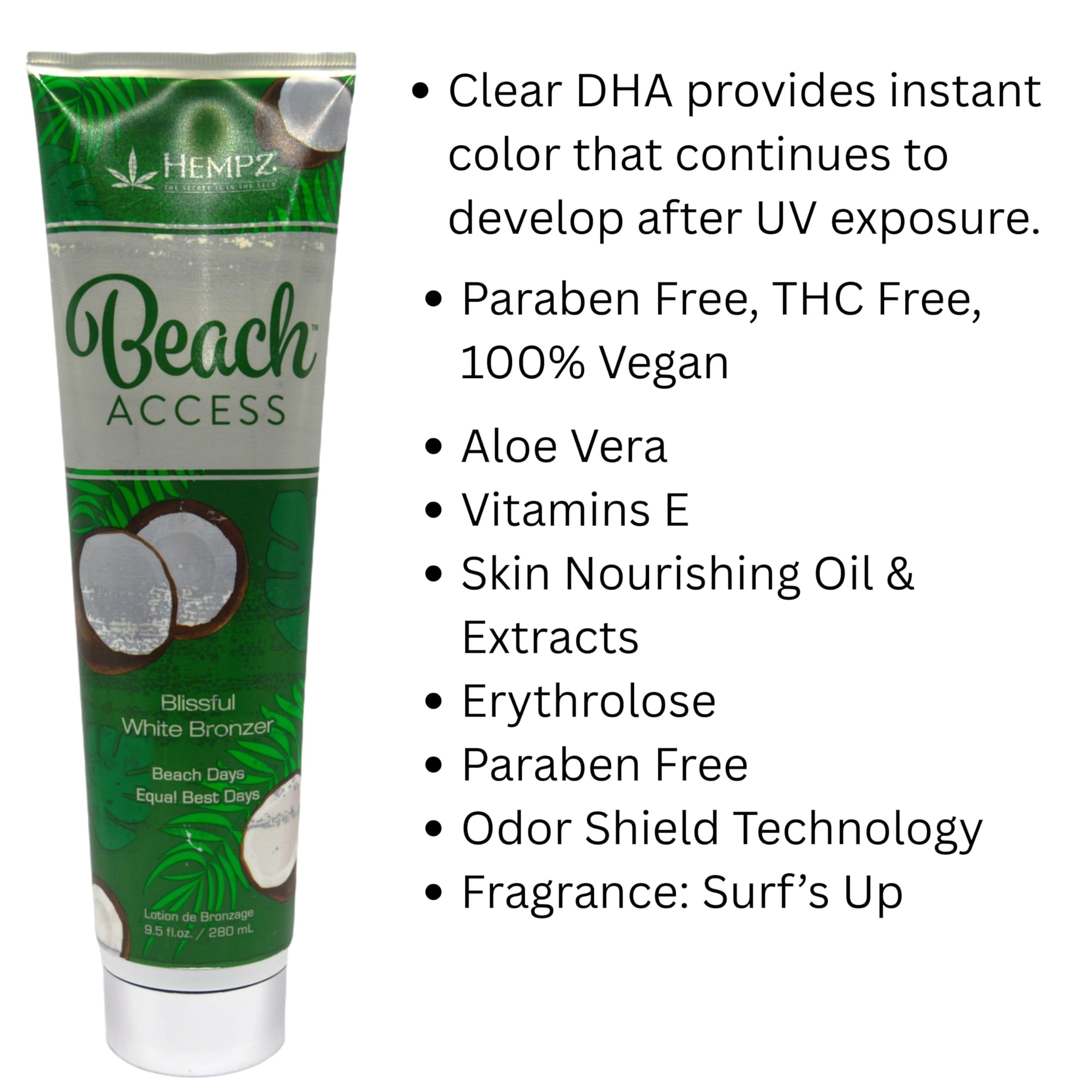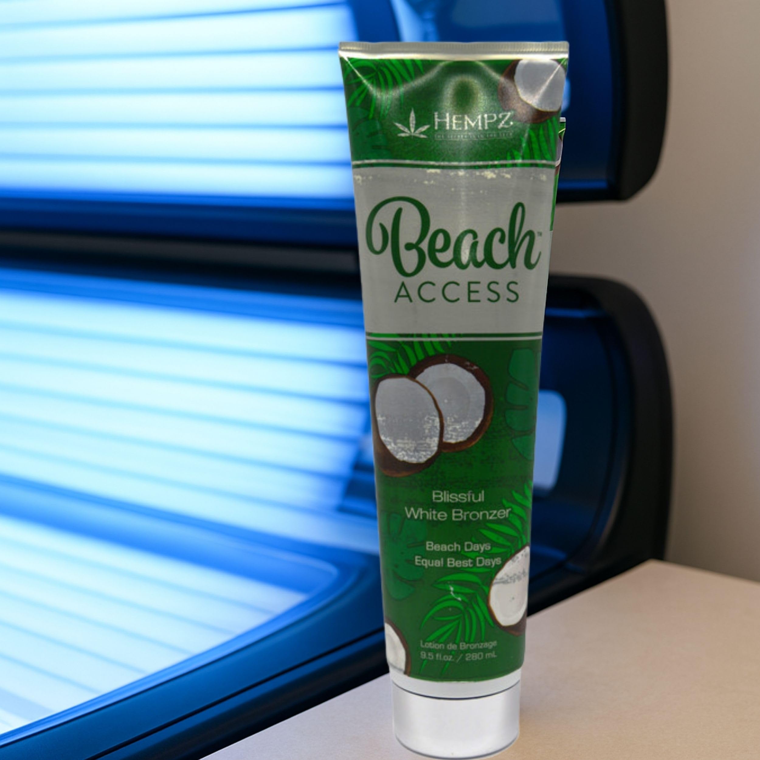 Beach Access Blissful White Bronzer – 9.5 fl. oz. CONDITION NOTE: Some bottles may show minor label discoloration from the adhesive used during application. This is purely cosmetic and does not affect the product’s safety, freshness, or performance. Instant Beach Glow, Every Day! Experience a streak-free, sun-kissed tan with this Blissful White Bronzer designed for both indoor and outdoor tanning. Beach Access Tanning Bed Lotion provides a naturally radiant glow that continues to develop long after UV exposure. What It Does: Instant & Gradual Color – DHA and Erythrolose deliver color that deepens beautifully after tanning. Hydrates & Conditions – 100% Pure Natural Hemp Seed Oil locks in moisture for smooth, supple skin. Brightens Skin Tone – Pineapple and Coconut Oils rich in Vitamins A & C help even and illuminate skin. Protects & Smooths – Guava and Aloe Vera antioxidants help reduce the look of fine lines. Odor Shield Technology – Keeps your post-tan skin fresh and lightly scented. Who It’s For: Perfect for all tanning levels—whether you tan in the sun, at the salon, or both. Clean Formula: Paraben Free THC Free 100% Vegan Infused with Aloe Vera, Vitamin E, and nourishing skin extracts. Fragrance: Surf’s Up – a refreshing tropical scent that captures the feeling of summer.