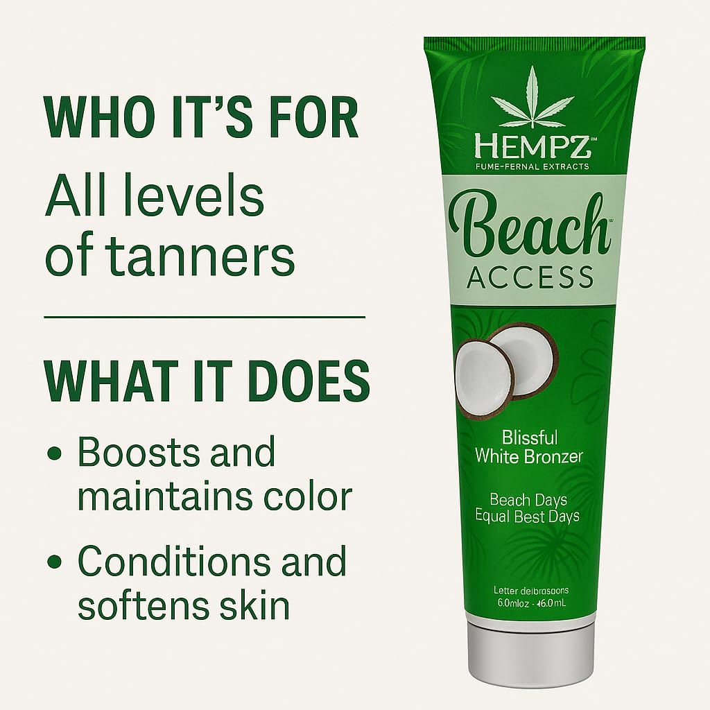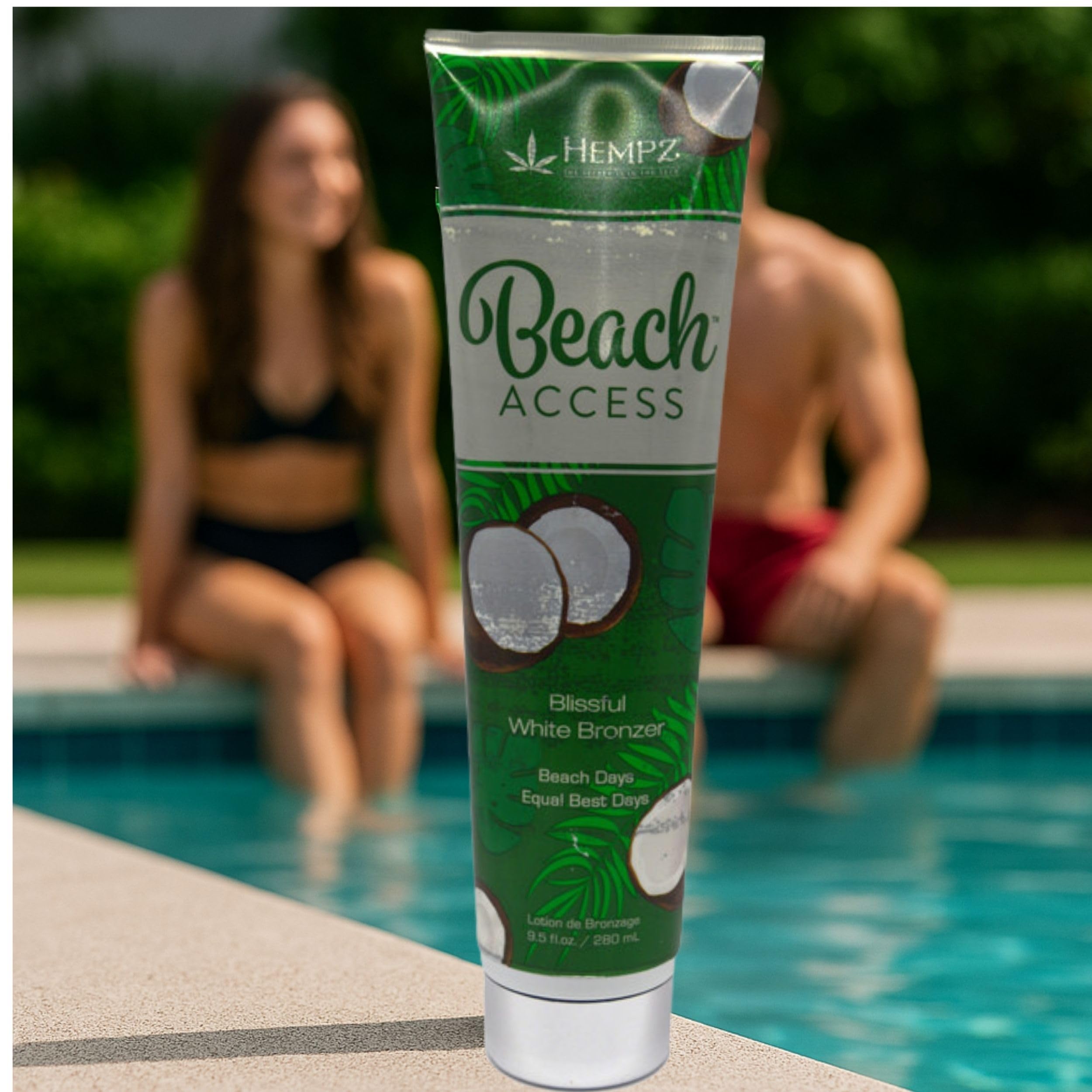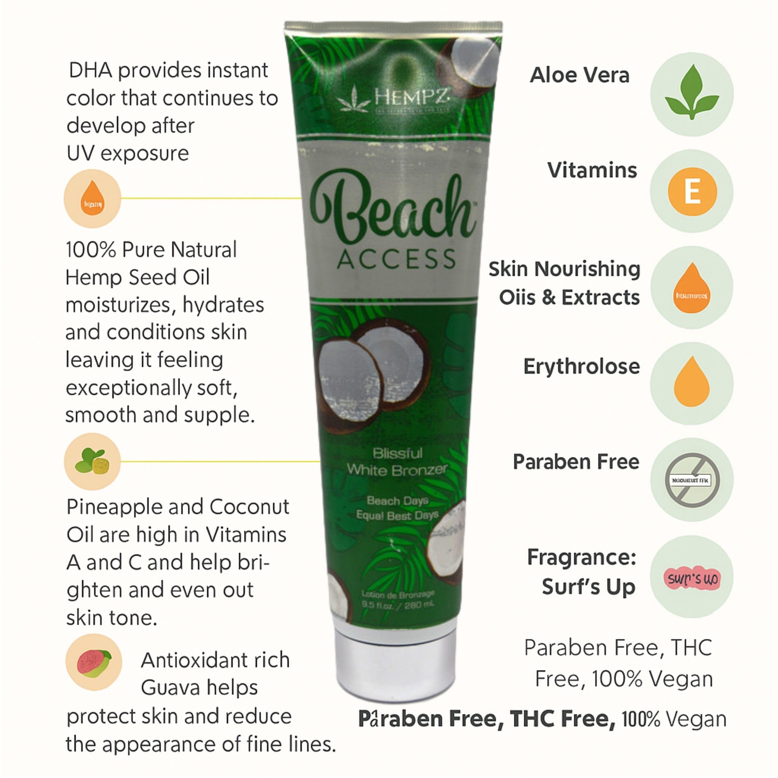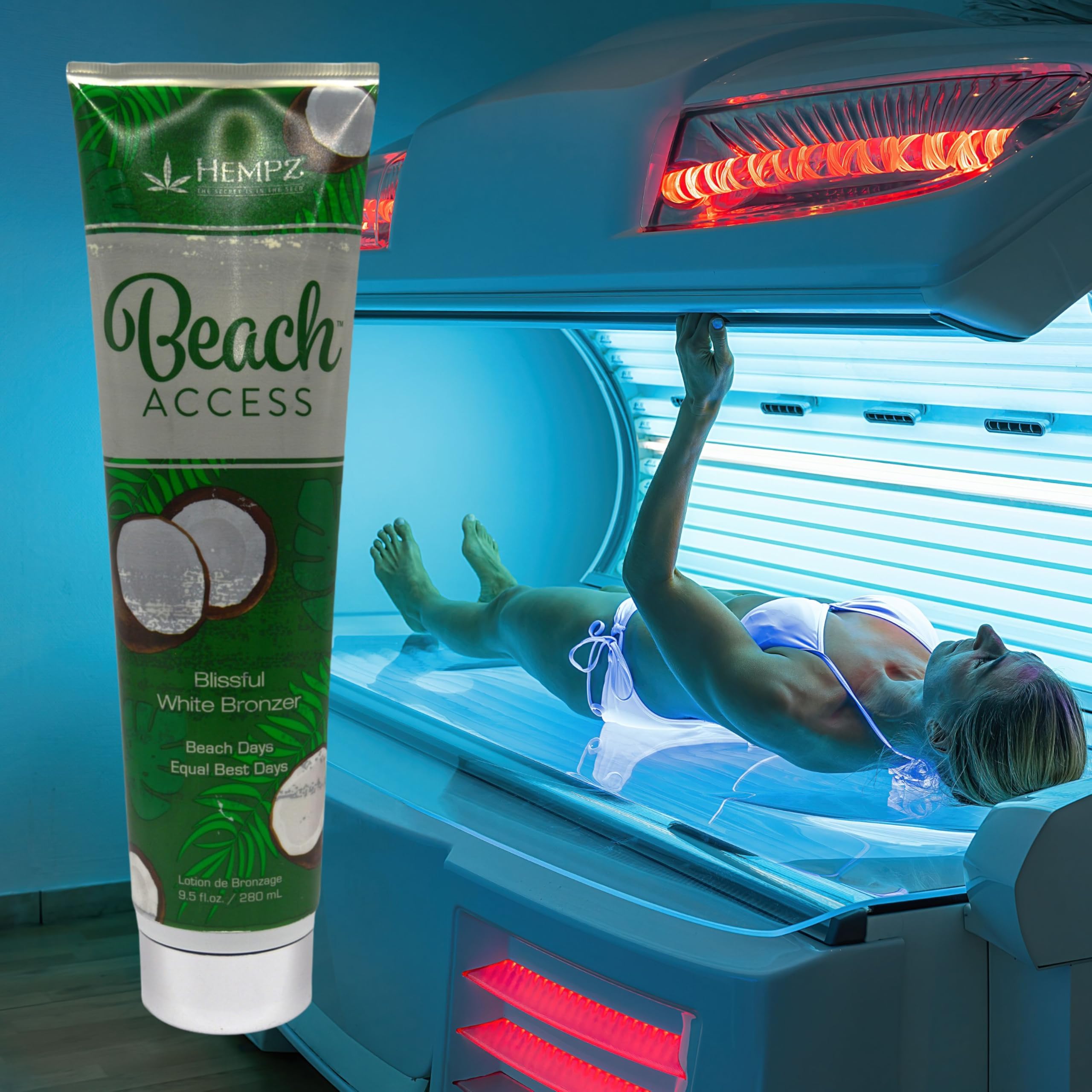 Beach Access Blissful White Bronzer – 9.5 fl. oz. CONDITION NOTE: Some bottles may show minor label discoloration from the adhesive used during application. This is purely cosmetic and does not affect the product’s safety, freshness, or performance. Instant Beach Glow, Every Day! Experience a streak-free, sun-kissed tan with this Blissful White Bronzer designed for both indoor and outdoor tanning. Beach Access Tanning Bed Lotion provides a naturally radiant glow that continues to develop long after UV exposure. What It Does: Instant & Gradual Color – DHA and Erythrolose deliver color that deepens beautifully after tanning. Hydrates & Conditions – 100% Pure Natural Hemp Seed Oil locks in moisture for smooth, supple skin. Brightens Skin Tone – Pineapple and Coconut Oils rich in Vitamins A & C help even and illuminate skin. Protects & Smooths – Guava and Aloe Vera antioxidants help reduce the look of fine lines. Odor Shield Technology – Keeps your post-tan skin fresh and lightly scented. Who It’s For: Perfect for all tanning levels—whether you tan in the sun, at the salon, or both. Clean Formula: Paraben Free THC Free 100% Vegan Infused with Aloe Vera, Vitamin E, and nourishing skin extracts. Fragrance: Surf’s Up – a refreshing tropical scent that captures the feeling of summer.