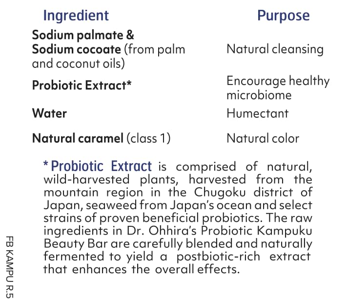Your order contains a box of Dr Ohhira's Probiotics Original Formula 100 capsules and 1 trial-size bar of Kampuku Beauty Bar Soap, also known as the Kampuku probiotic bar. Dr Ohhira Probiotics from Essential Formulas: Backed by 30 years of research No refrigeration required. The three-year fermentation process at seasonal temperatures encourages survival of the strongest bacteria and makes these 13 Probiotic Strains shelf-stable without refrigeration. Enhanced with fermented super fruits: Goji berries, Figs, Blueberries, Plums, Red Bayberries, Yuzu Fruit 13 strains = better results. Not freeze dried. Dr Ohhira's includes the POST BIOTIC METABOLITES, such as vitamins, amino acids, and chelated minerals created from the probiotics processing the fruits/veggies.