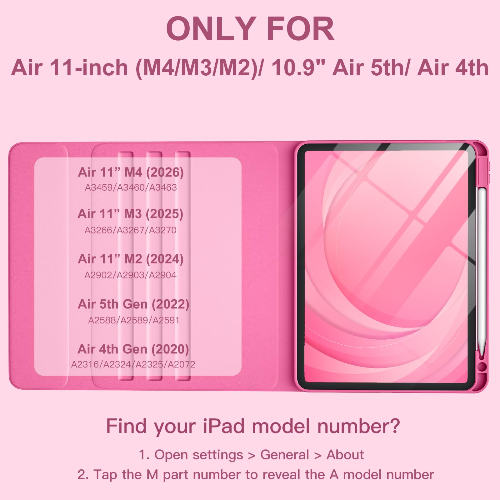 ❤【Compatibility】This air keyboard case is compatible for iPad Air 11-inch (M4) 2026 (Model Number: A3459/A3460/A3463), for iPad Air 11-inch (M3) 2025 (Model Number: A2902/AA2903/A2904), for iPad Air 11-inch (M2) 2024 (Model Number: A3266/A3267/A3270), for iPad Air 5th Generation (Model Number: A2588/A2589/A2591), for iPad Air 4th Generation 10.9 inch (Model Number: A2316/A2324/A2325/A2072). Not for other devices. Please be kindly check the model number No. starting with the letter "A" of your tablet back before order
