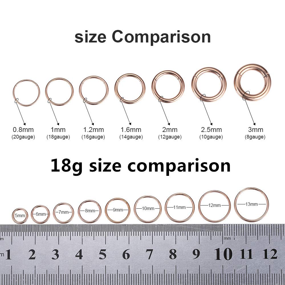 Sold individually Nose Hoop Ring/Earring Hoop Size: 18 gauge (thickness: 1.0mm), inner diameter 9/32 inches(7mm),Please choose your gauge and diameter hoop for your nose piercing needs.It has a smooth closure that doesn't slipped or opened. It's still tight after long-term use.