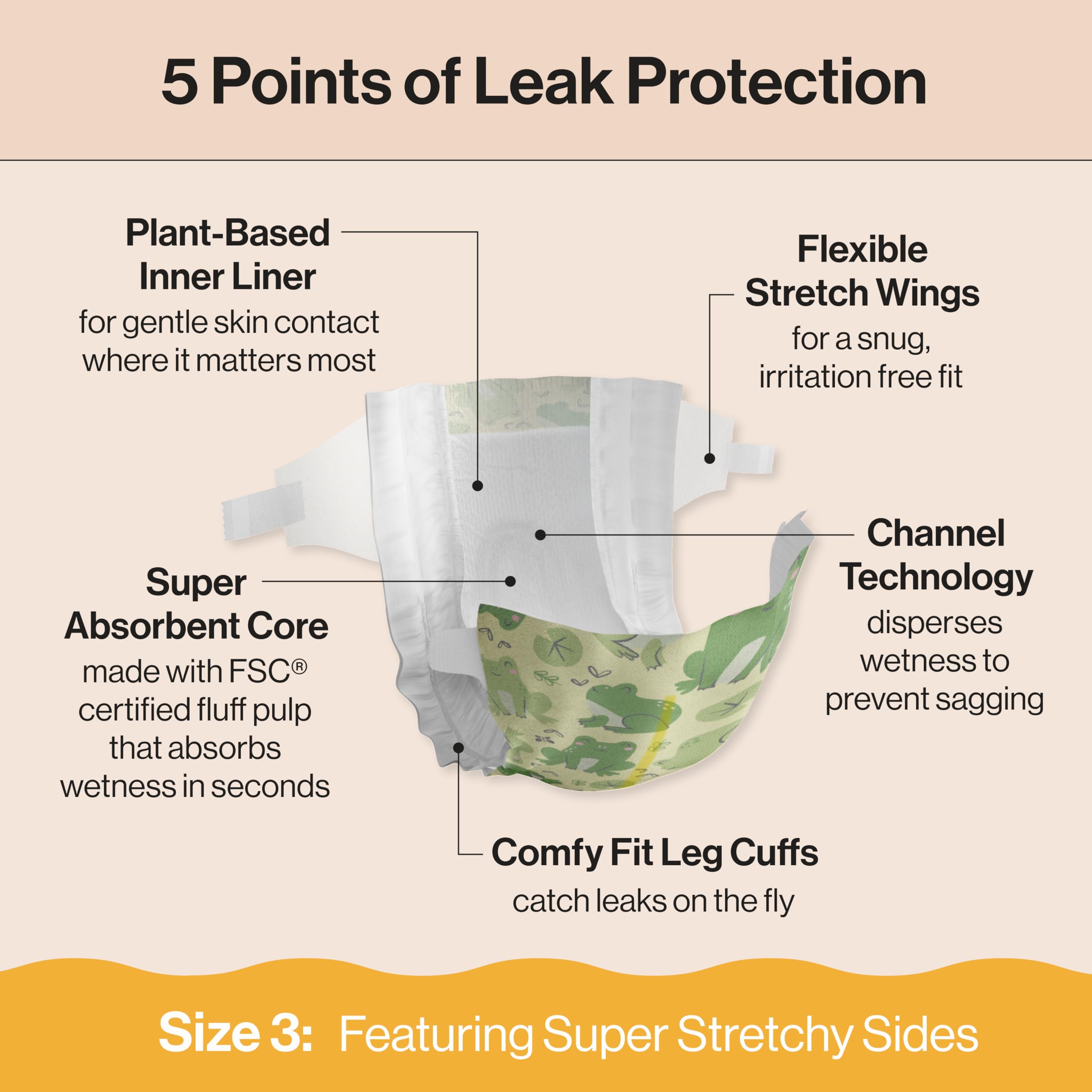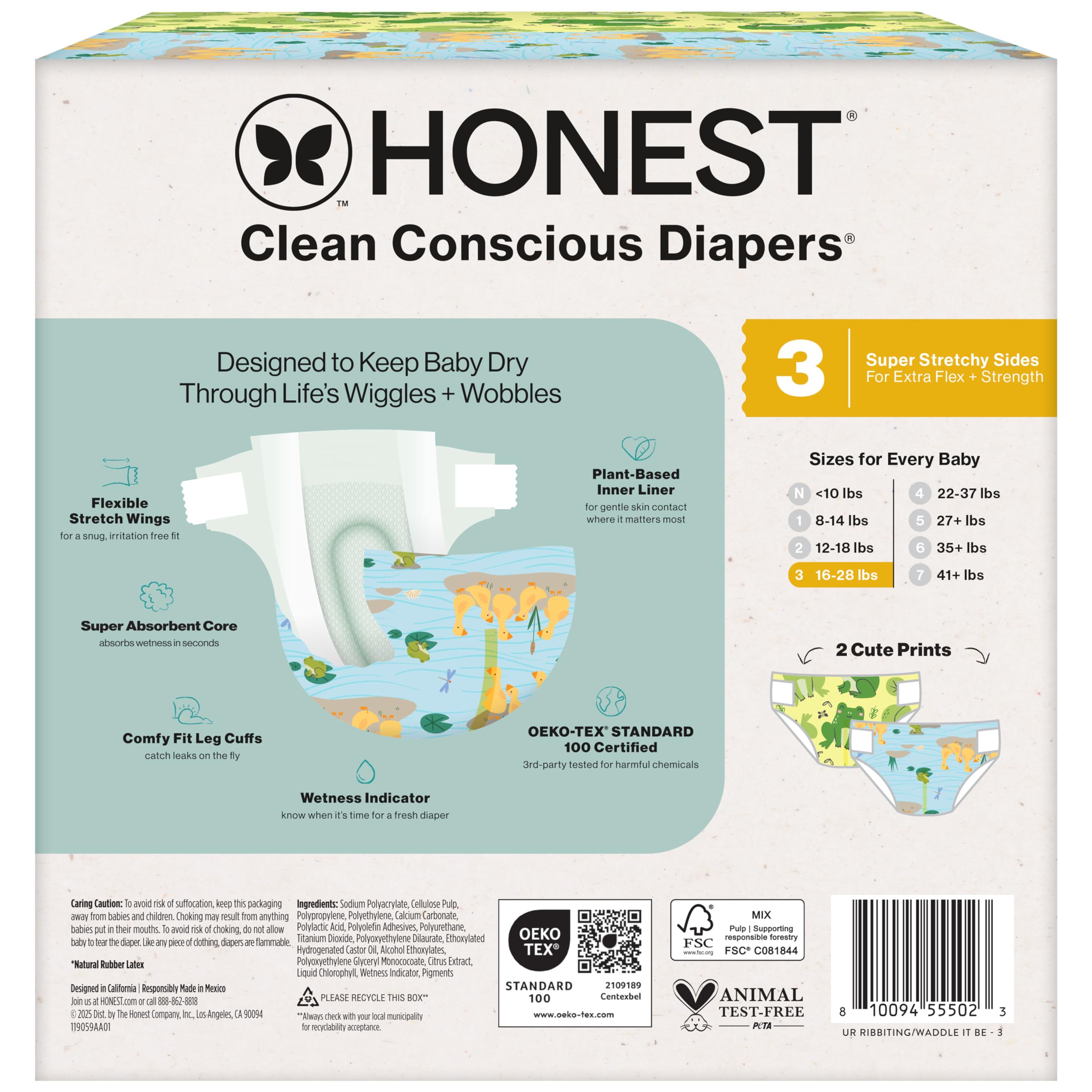 Designed to protect delicate skin, our Clean Conscious Diapers® keep baby comfortable and dry through all the wiggles + wobbles! They deliver up to 100% leak protection with Comfort Dry Technology, a super absorbent core and hypoallergenic, plant-based inner liner for gentle skin contact. Our softest diaper yet features comfy leg cuffs and flexible stretchy wings for a cozy snug, irritation-free fit. And because safety is our top priority, they're made without elemental chlorine, parabens, fragrance and natural rubber latex, and OEKO-TEX® STANDARD 100 certified –3rd party tested for 350 harmful chemicals. For cuteness overload, each diaper features a super cute print and wetness indicator so you know when it's time for a fresh one. How to Use: Lie your baby down on their back, on a safe, flat surface. Lift them gently to place the diaper under them. Bring the diaper front over and up to your baby’s stomach, and use the adhesive diaper tabs to fasten securely. To minimize leaks, make sure the diaper’s leg cuffs are pulled out, rather than tucked in. Materials: Absorbent Bio-Core [Elemental Chlorine Free (ECF) Wood Pulp From Responsibly Managed Forests and other controlled sources], Sodium Polyacrylate containing plant derived odor Inhibitors including Citrus Extract & Liquid Chlorophyll, Outer Layer (Polypropylene), Inner Layer (Plant-Based PLA & Polyethylene), Leg/Waist System (Polymer Spandex & Polypropylene), Polyolefin Adhesives in the Seams & Joints, Wetness Indicator, Super-Cute Design on Backsheet (Inks) Caution: To avoid risk of suffocation, keep this packaging away from babies and children. Choking may result from anything babies put in their mouths. To avoid risk of choking, do not allow baby to tear the diaper. Like any piece of clothing, diapers are flammable.