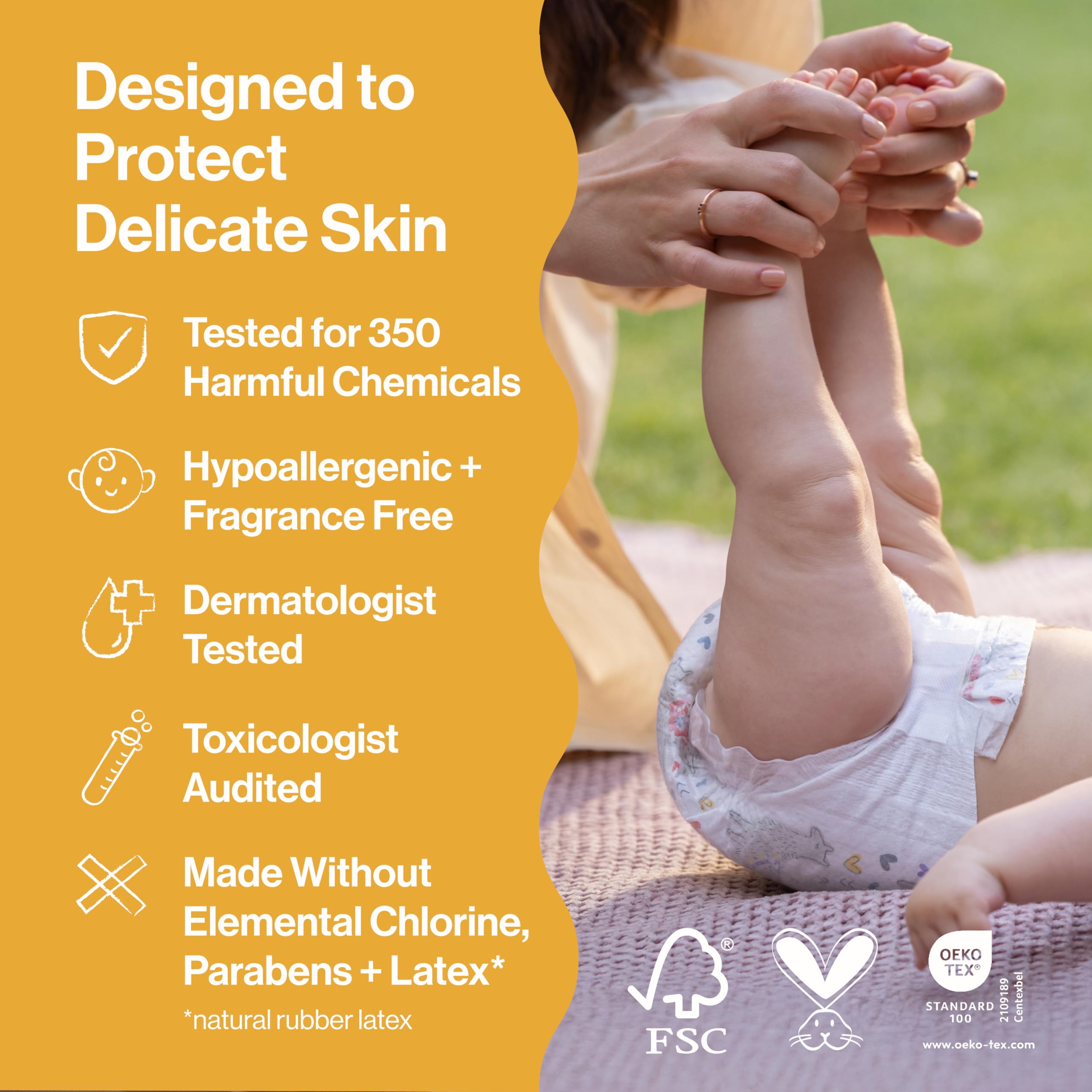 DESIGNED FOR DELICATE SKIN: Hypoallergenic, fragrance free diapers with a plant-based inner liner for gentle skin contact