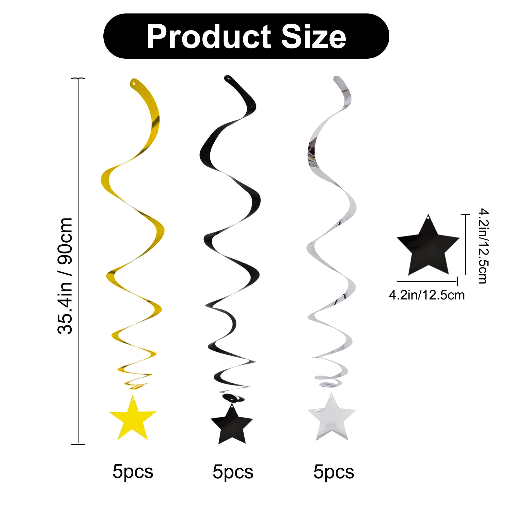 PACKAGE INCLUDE: A total of 15 pcs hanging swirl decorations, including 15 gold double swirls and 15 swirls with PVC star. There are 15 strings in total, each of which is connected with a gold double swirls and a gold PVC star. Flexible swirls, hanging length can extend to approx 36"/91cm long.
