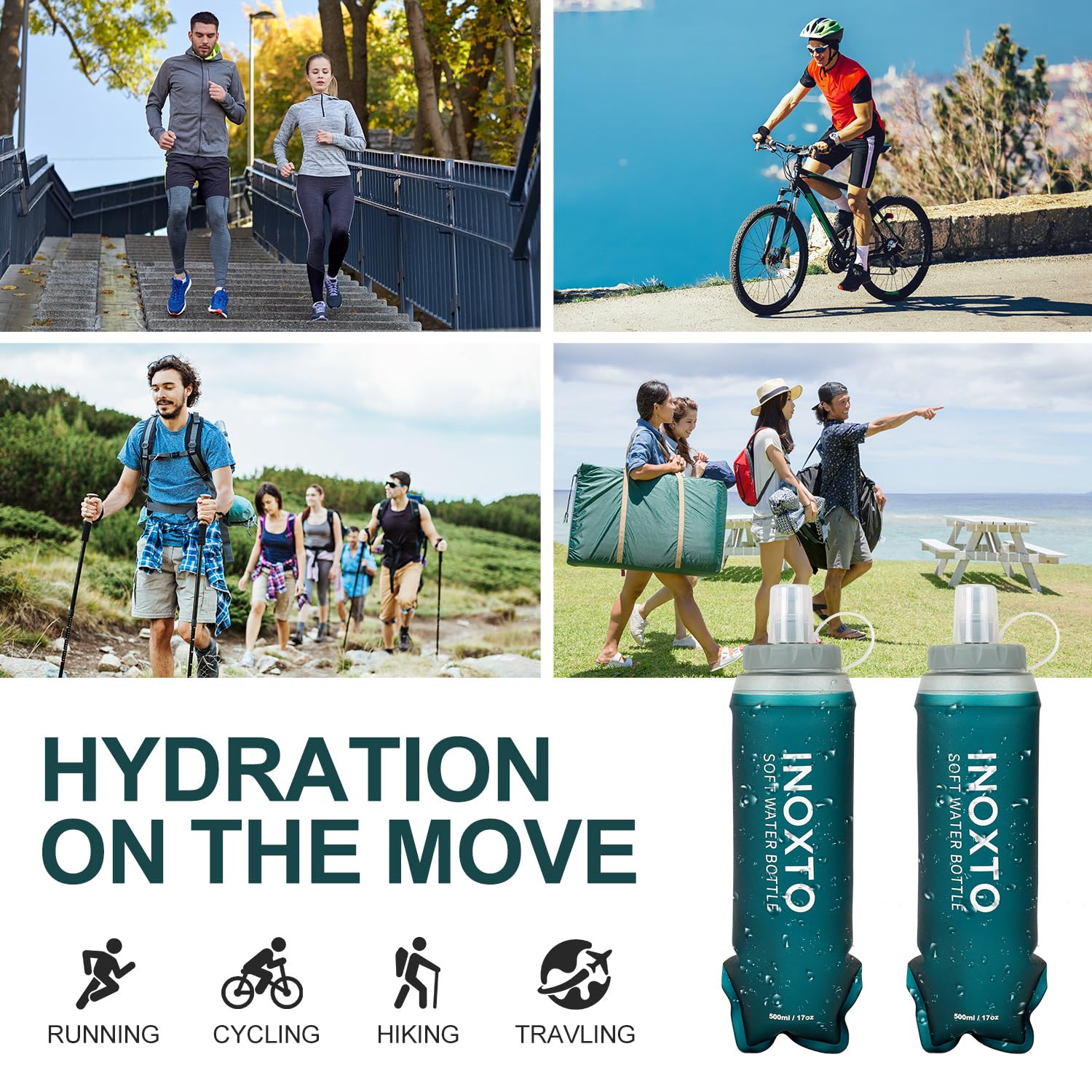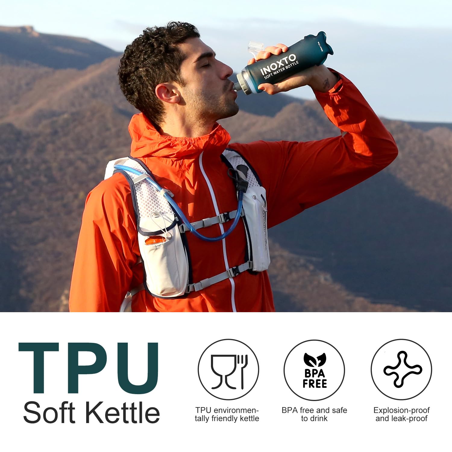 đ§ăCOLLAPSIBLE WATER BOTTLESă: INOXTO flexible water bottle is soft and foldable, easy to use, easy to store, let your running more easily;It can be easily folded or tucked into your pocket. Our collapsible water bottles are designed to hold minimal air so the water doesn't slosh around.