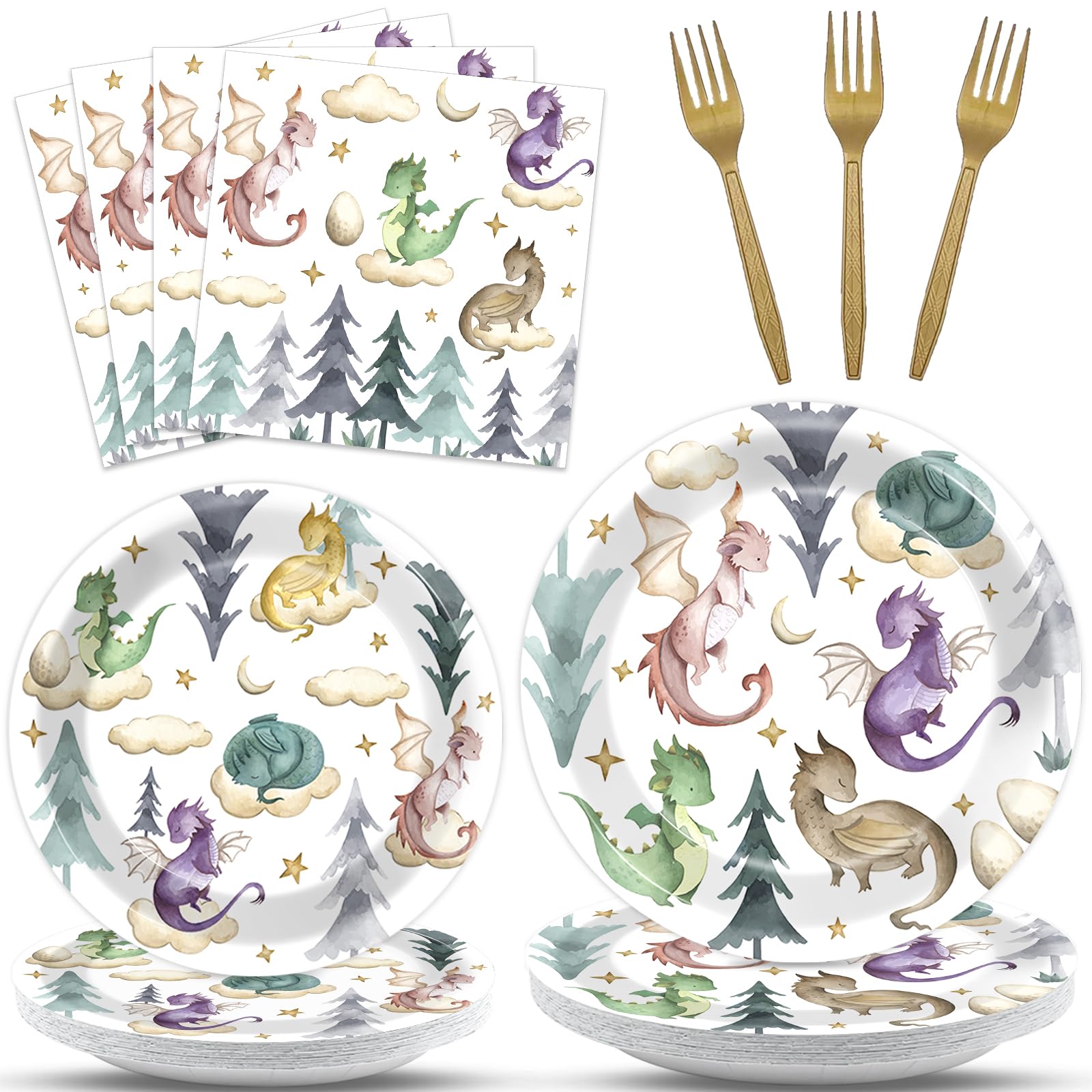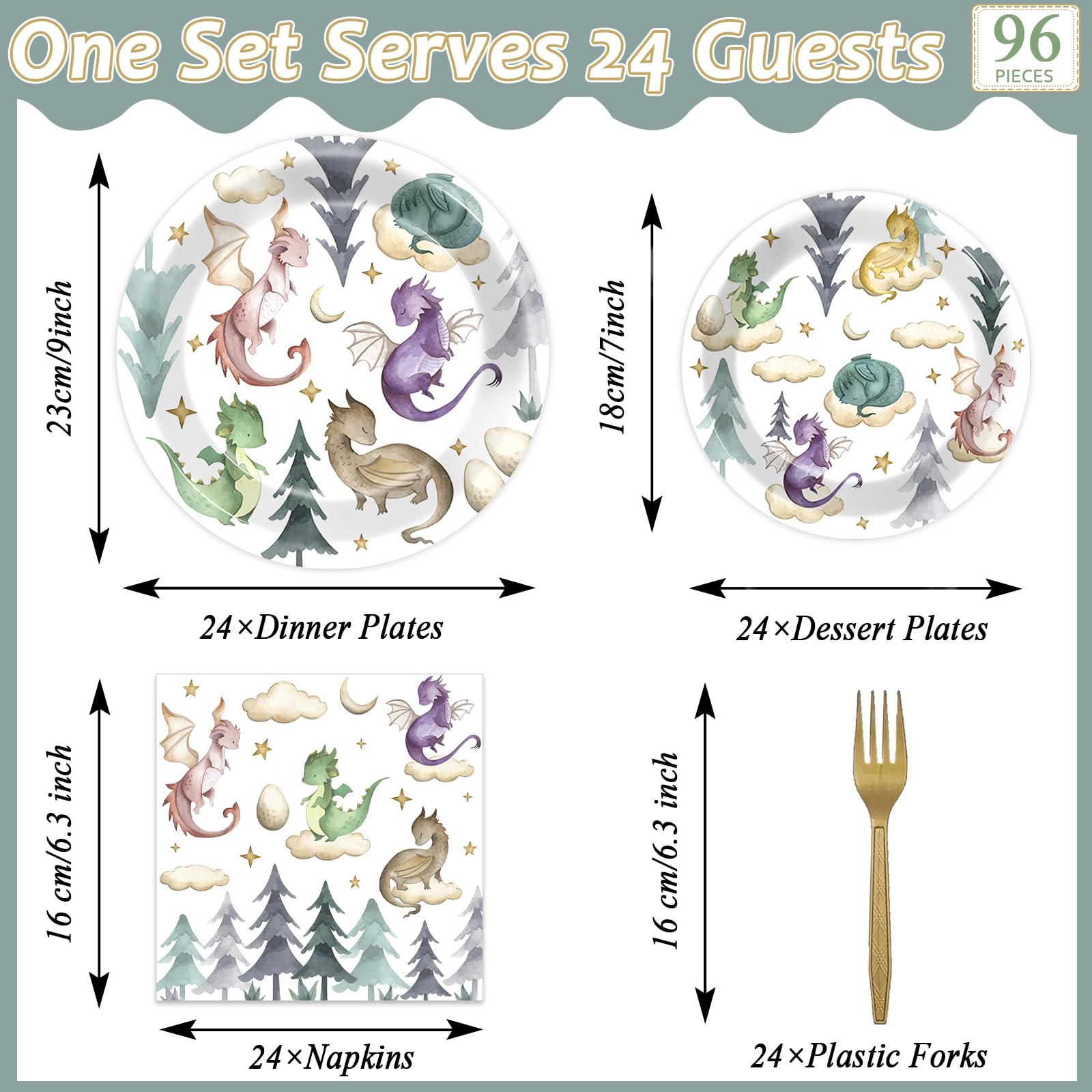 Package includes: you will receive 96 pcs watercolor dragon tableware, including 24 pcs 9 inch plates, 24 pcs 7 inch plates, 24 napkins, 24 forks. This tableware set can meet the needs of 24 guests.