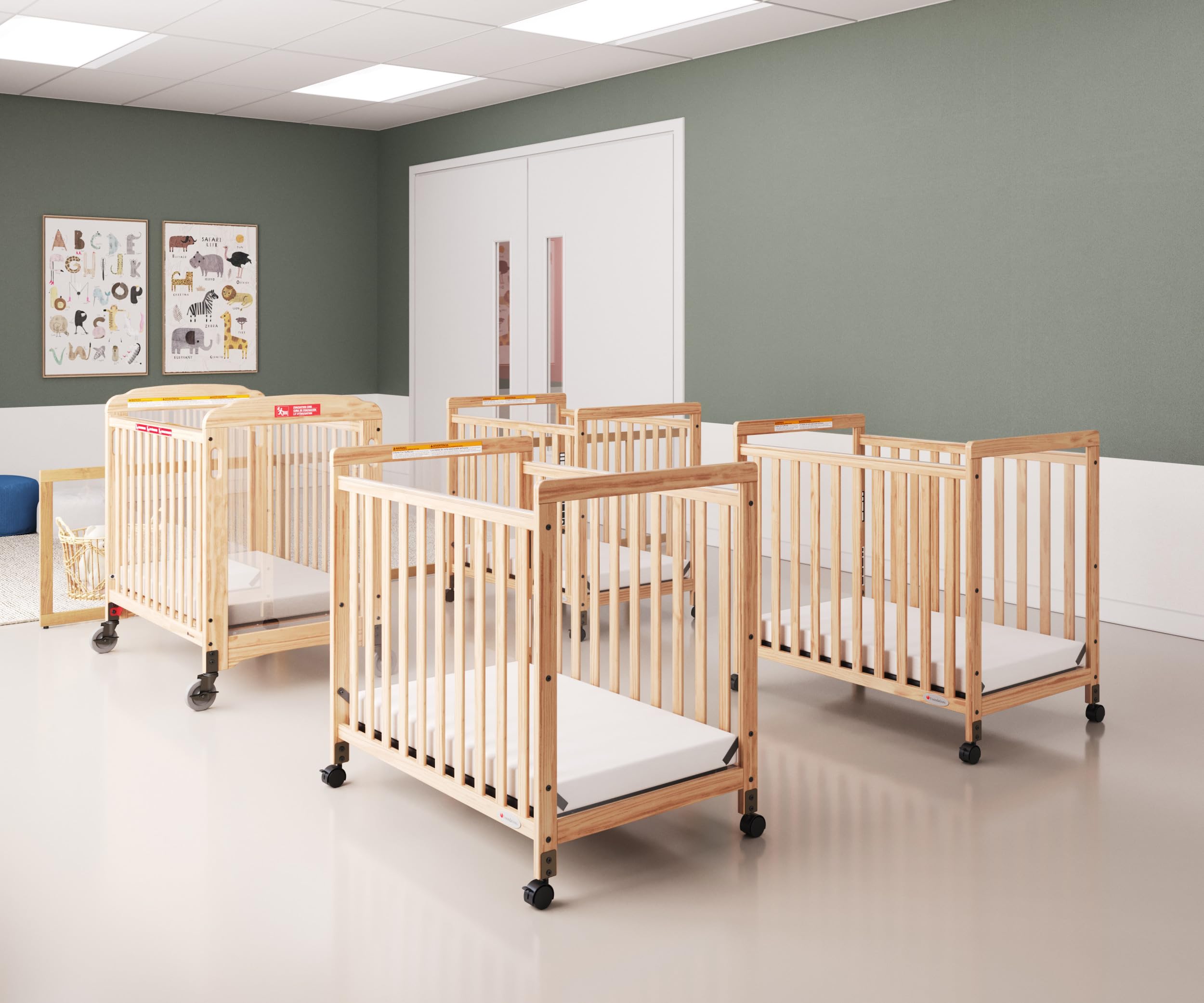 Non-Marking Wheels: Quiet casters allow smooth room-to-room mobility without damaging floors. Two wheels lock securely in place when stationary, keeping the crib safe and stable for daily childcare use.