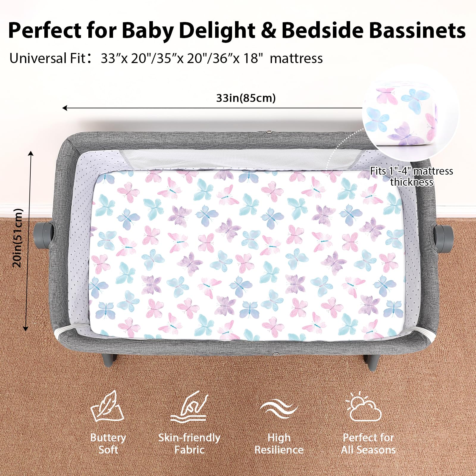 Snug Fit: Measuring 33β x 20β, the 3 pack bassinet fitted sheets fit most bedside sleeper bassinet mattresses. With full elastic edges of the bassinet sheets, a 6-inch deep pocket, and stretchy fabric, they ensure a snug, wrinkle-free fit that stays securely in place, even during your babyβs most active nights.