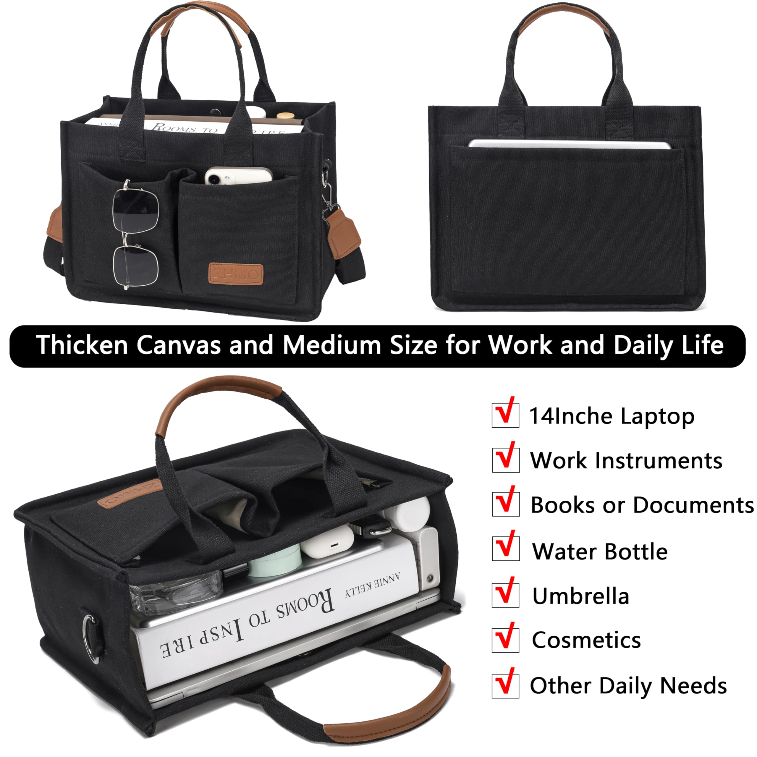 💗Spacious Compartments Organize Well:Designed with padded computer compartment for 14 inche laptop,inner cup holder for tumbler,2 front outside pockets for cellphone and keys items need quick access,1 big back outside pocket for ipad or magazine,Large main compartment for books,documents,cosmetics and other belongings.