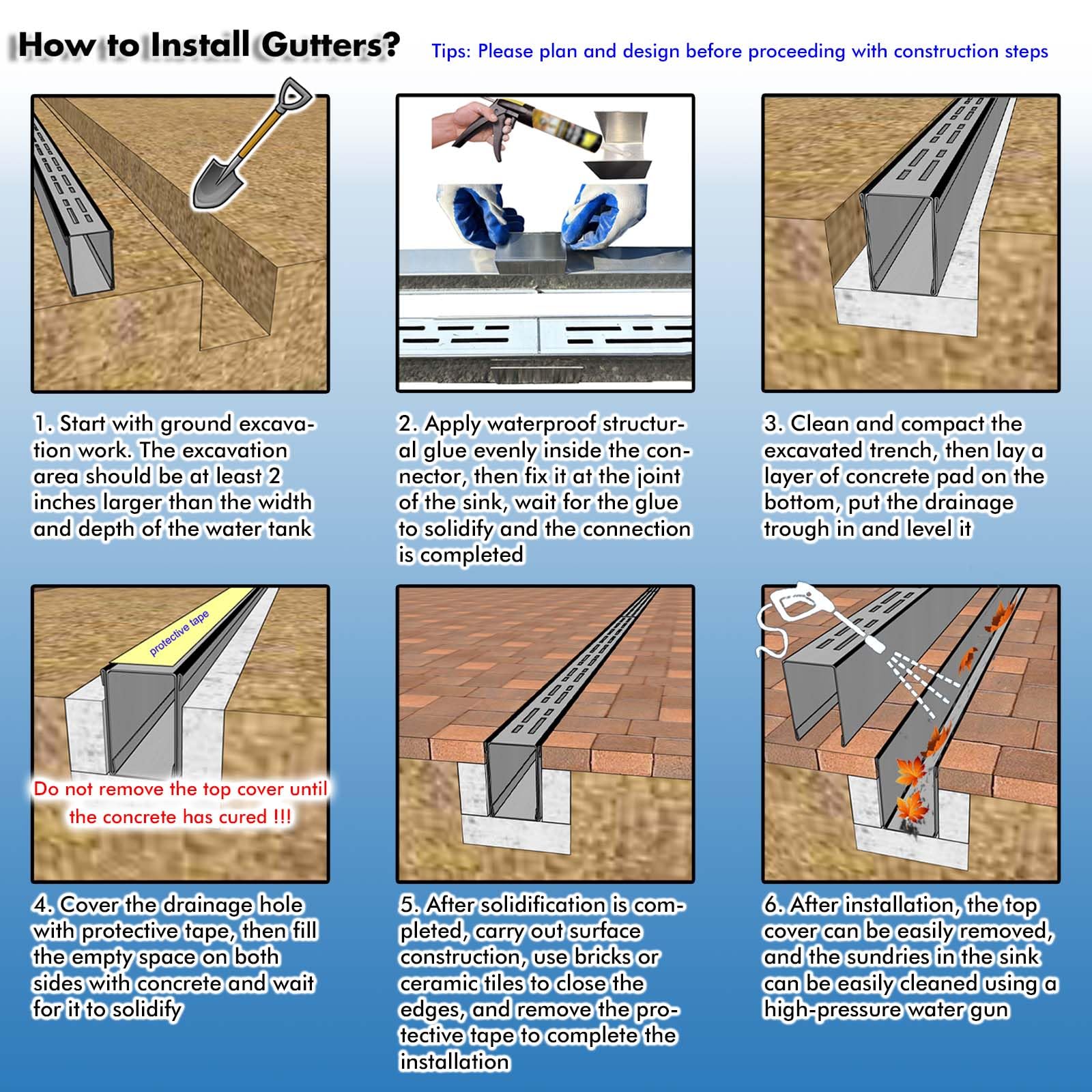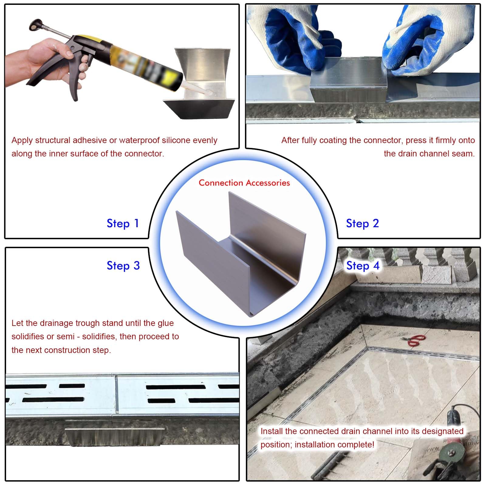 Connection of Channel Drains System: Each trench drain system is equipped with connection accessories, and you need to prepare the waterproof glue for construction; the store provides customized options such as right angles, tees, crosses, ports and ports with outlets