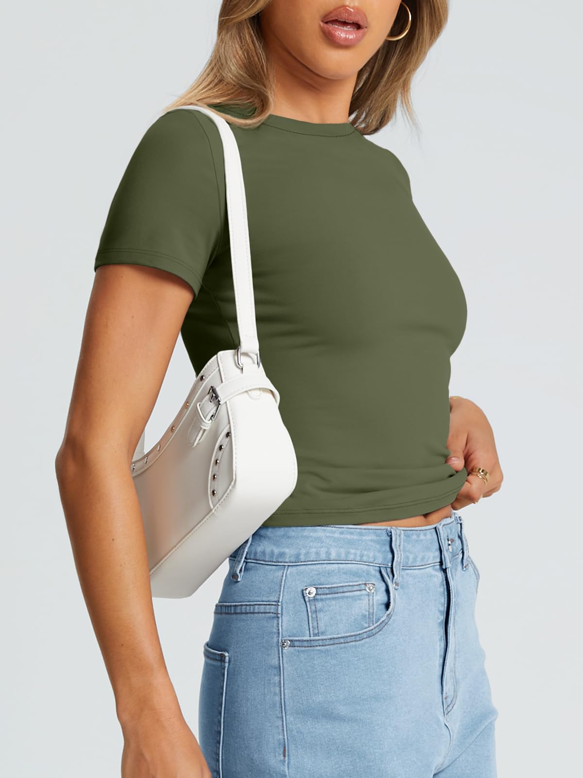 Design: This top features a cute, slim-fitted, and casual style with a crew neck and short sleeves. It comes in both cropped and regular styles, giving you the option to wear it as a regular top or fold it up for a trendy crop top look