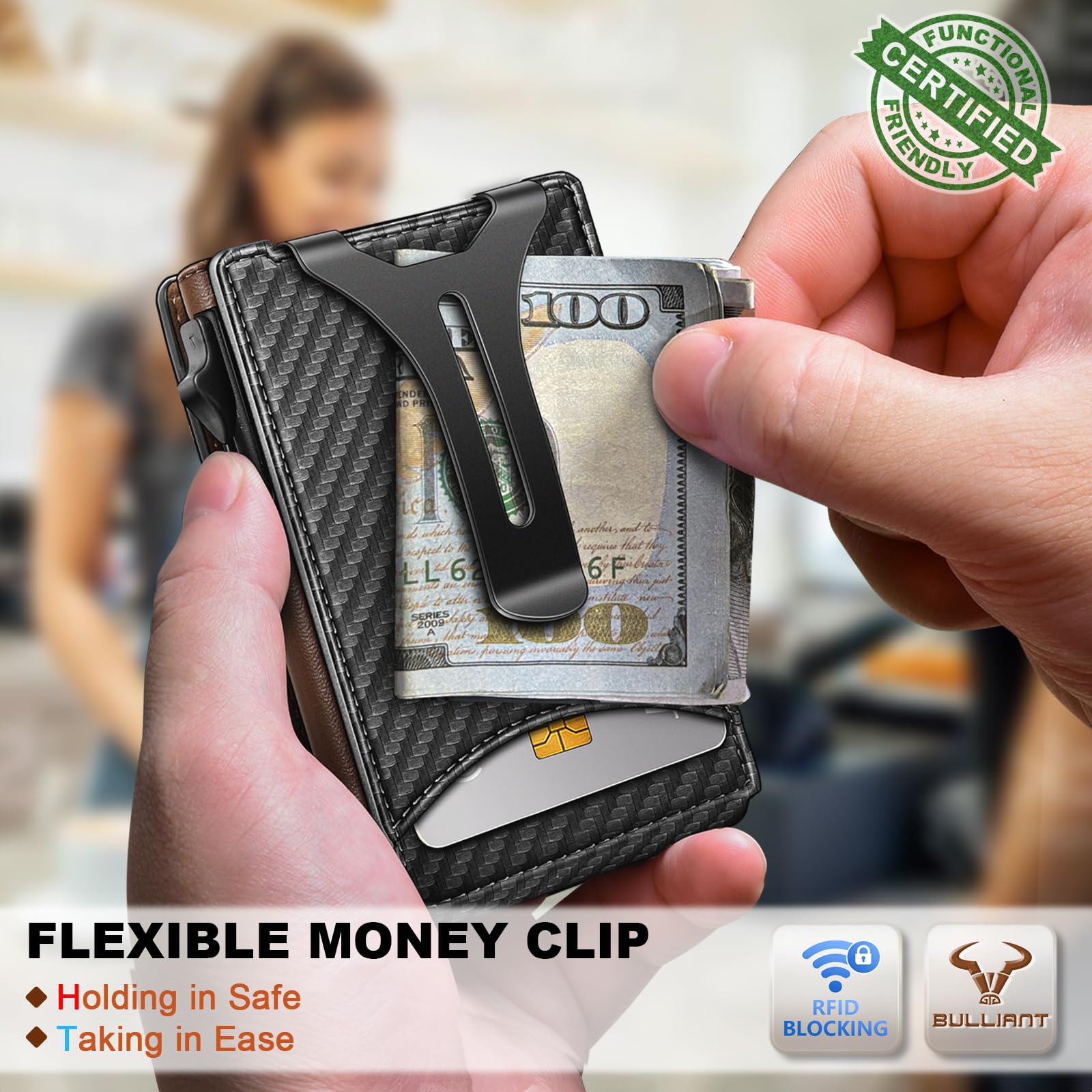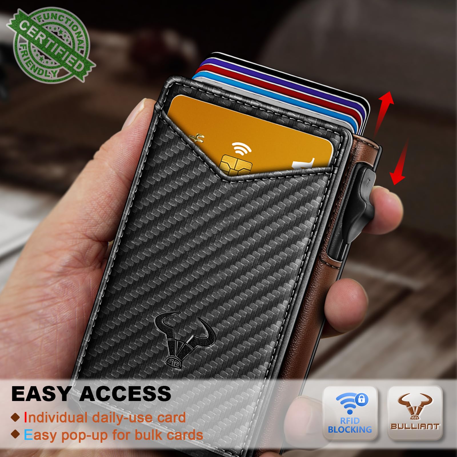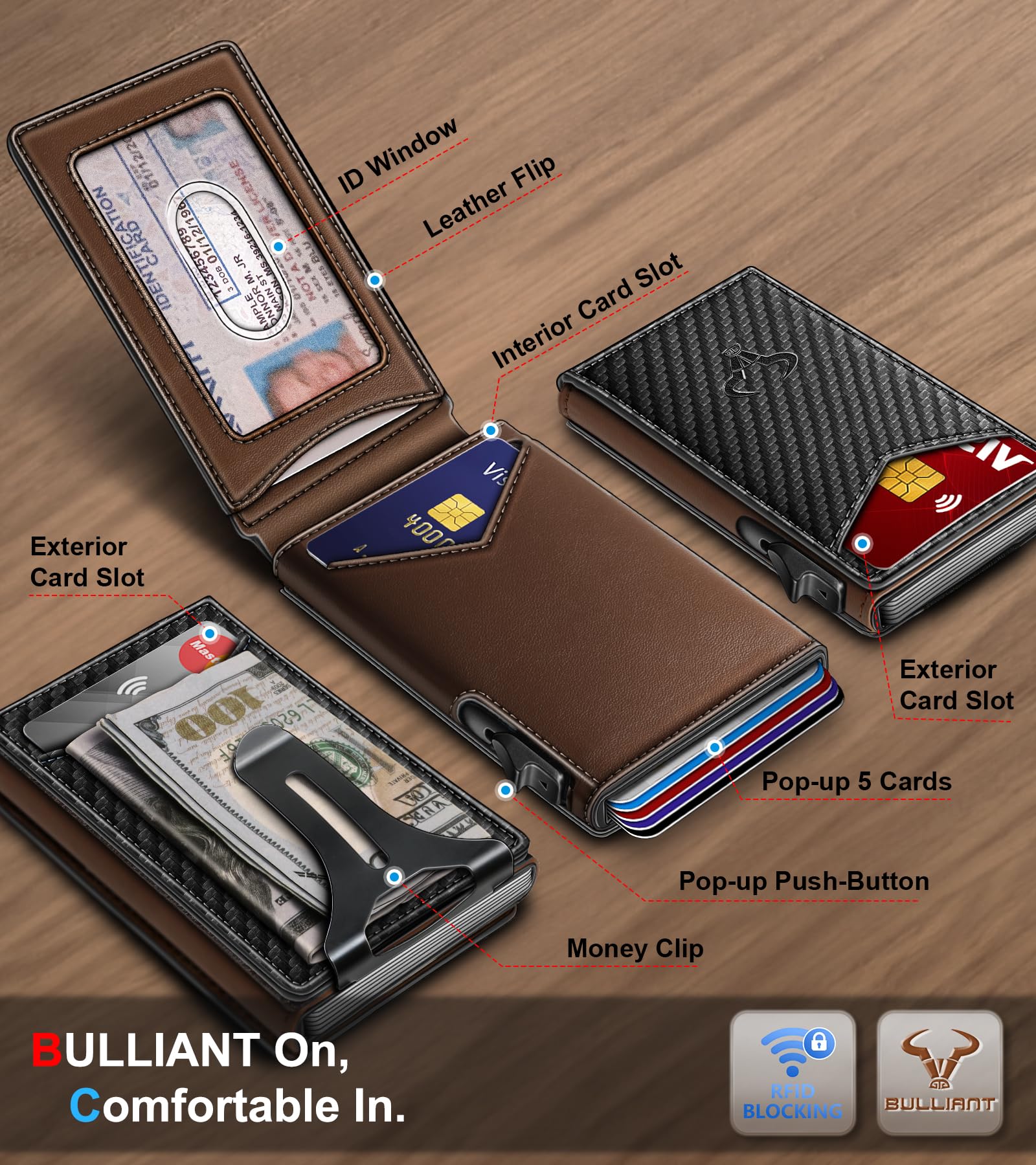 CAPACITY-Pop-up metal Case in flipping leather shell,9 card slots (including 1 ID window) and metal money clip for couple of bills;