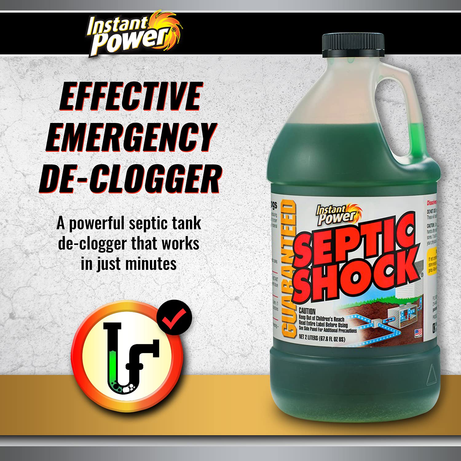 Product Description Instant Power Septic Shock septic tank treatment instantly unclogs a blocked or under-performing septic tank or cesspool. It dissolves paper, grease, soap, protein, and starches -- all the usual things that get in our drain system. Using a formulated blend of beneficial and powerful natural ingredients, this clogged drain cleaner clears crystallized soil and dissolves organic material blocking the system. Septic Shock liquid drain cleaner also eliminates odors and has no harsh chemicals, acids, or caustics, making it safe on all pipes and septic systems. This drain clog remover can be used in septic systems and RVs. From the Manufacturer Septic Shock quickly reconditions a clogged or under-performing septic tank or cesspool. Utilizing a formulated blend of beneficial live enzymes and bacteria, Septic Shock clears crystallized soil around the drain field to allow for proper porosity. At the same time, enzymes help digest other organic material clogging the system. Dissolves paper, grease, soap, protein, and starches! Eliminates odors! 100% Money-back Guarantee.