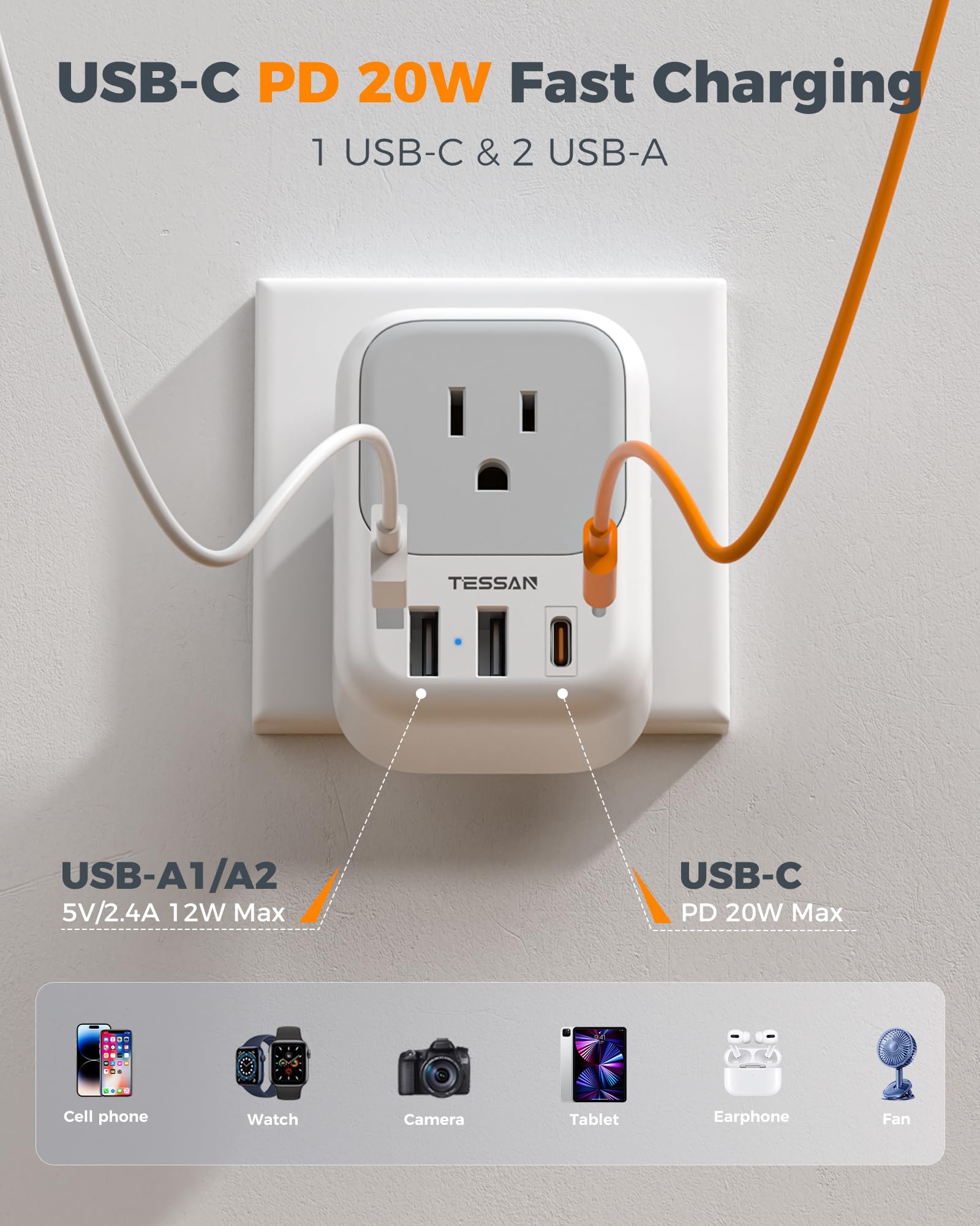 USB C 20W Speed Charging: The USB C of Japanese travel plug adapter output is 20W Max, quickly charging your phone, earphones and other devices; USA to Japan plug adapter also has 2 USB A port to meet the charging needs of various devices