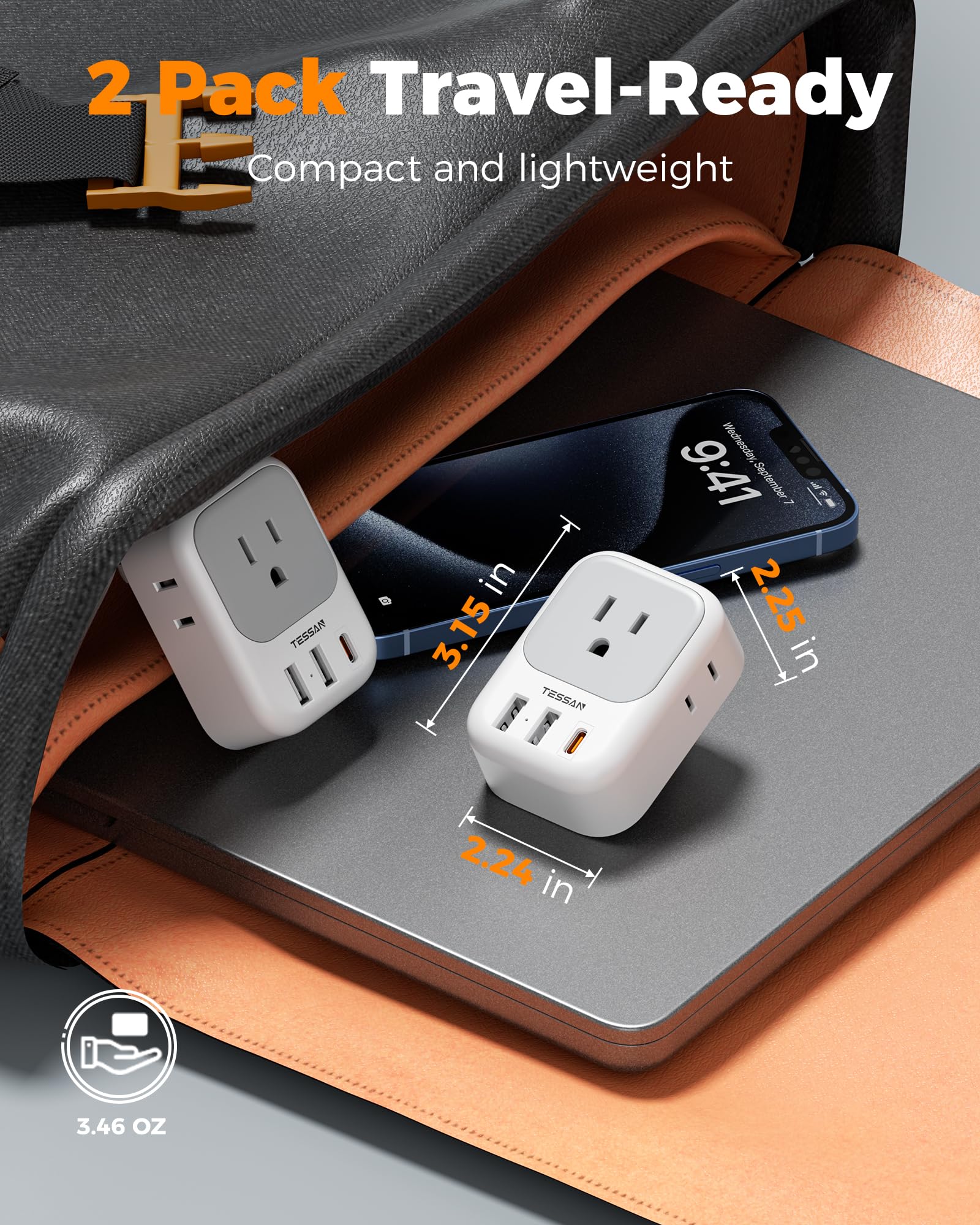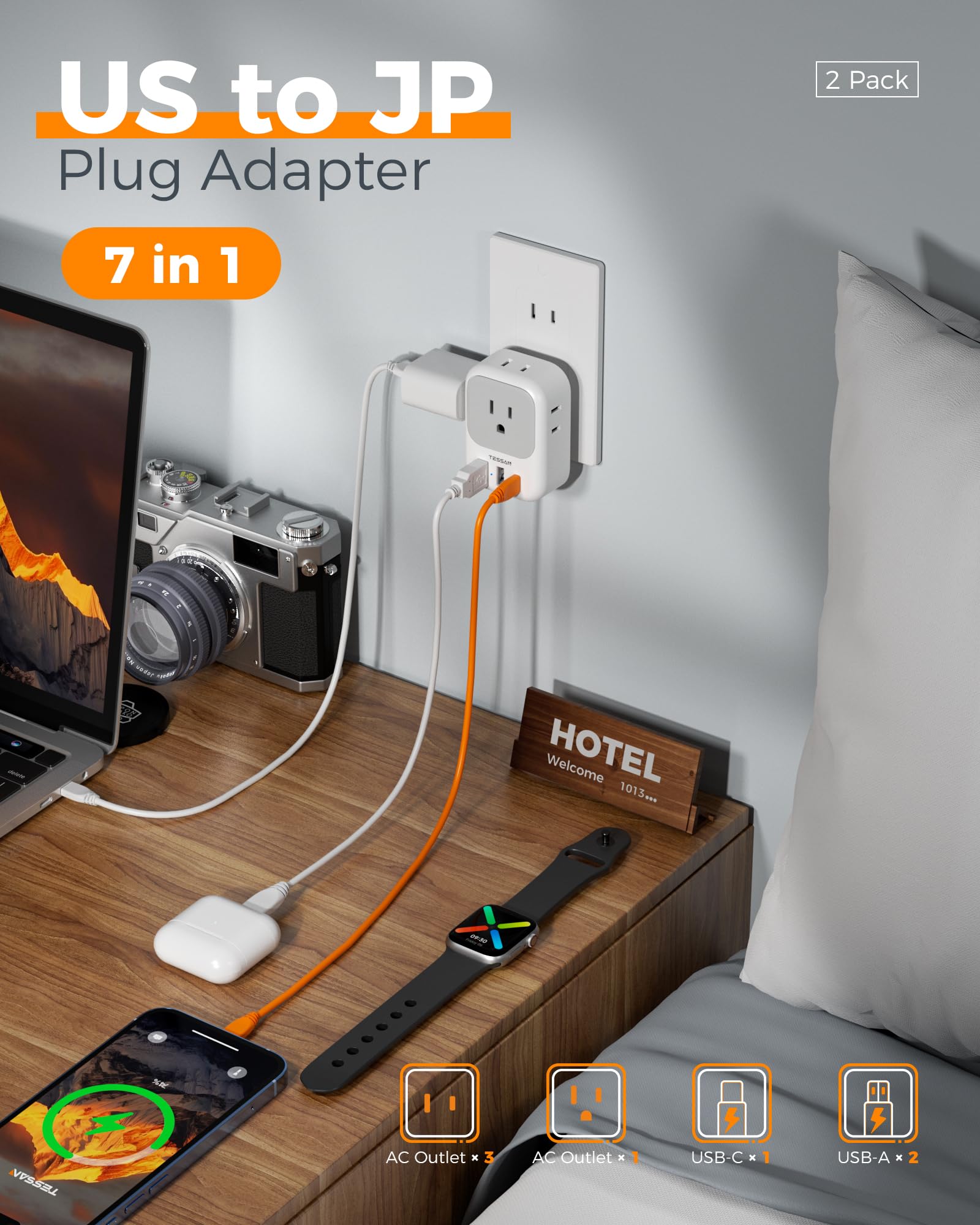 7 in 1 Japan Power Adapter: The japan charger adapter features 4 AC Outlet (1875W Max), 1 USB C (3A Max per port) and 2 USB A (2.4A Max); Japan outlet adapter can charge 7 devices simultaneously, reducing waiting time and no need to bring extra adapters