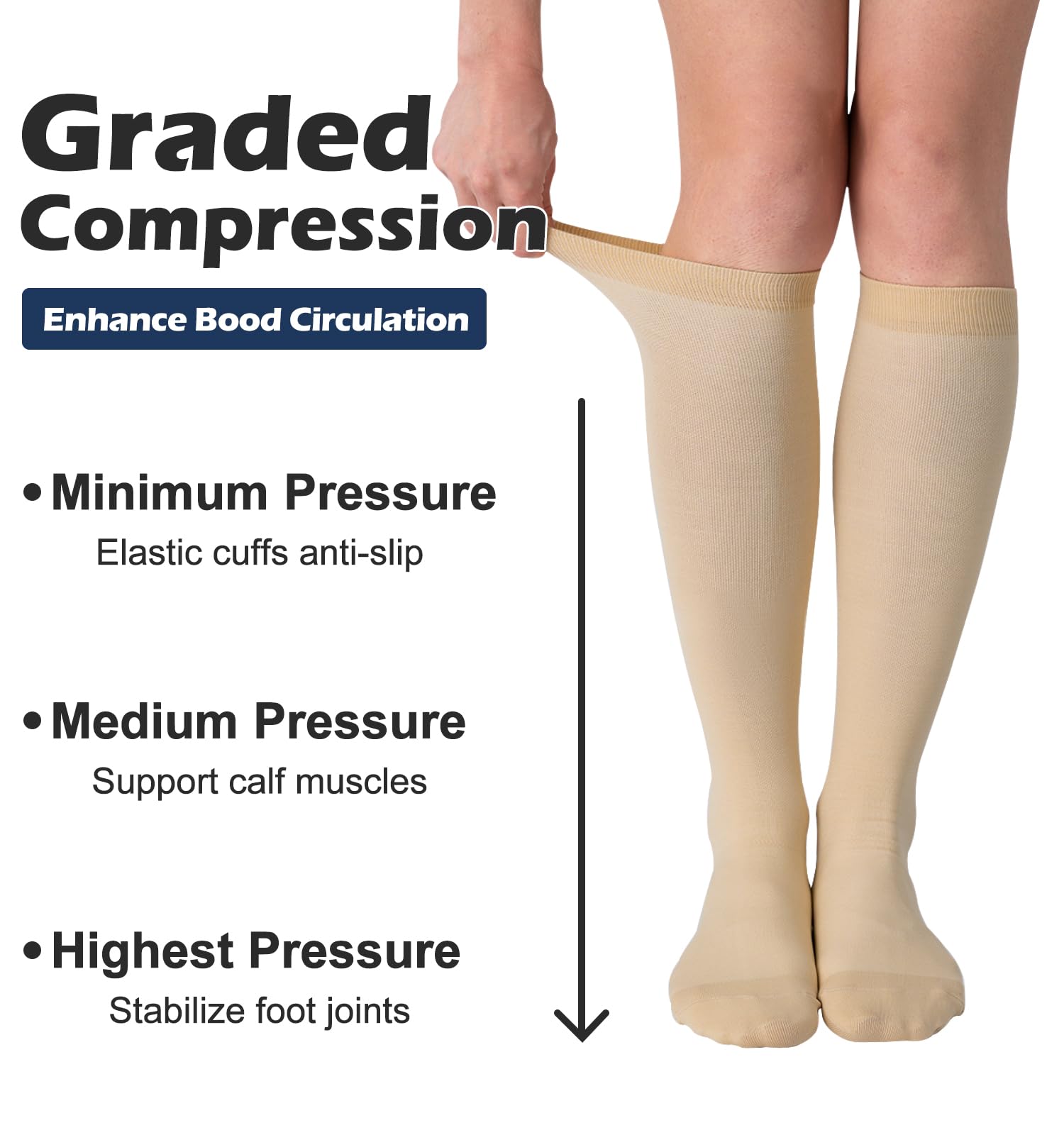 COMPRESSION: Our compression socks provide graduated compression, with pressure highest at the ankle and gradually decreasing upward. The targeted compression stimulates blood flow circulation, decreases muscular fatigue and improves athletic performance. These compression socks are suitable for sports training and daily wear.