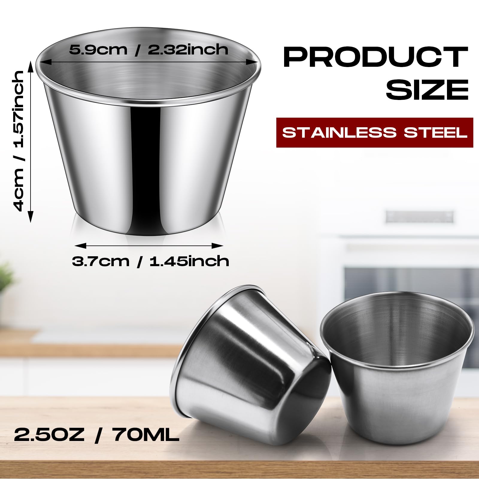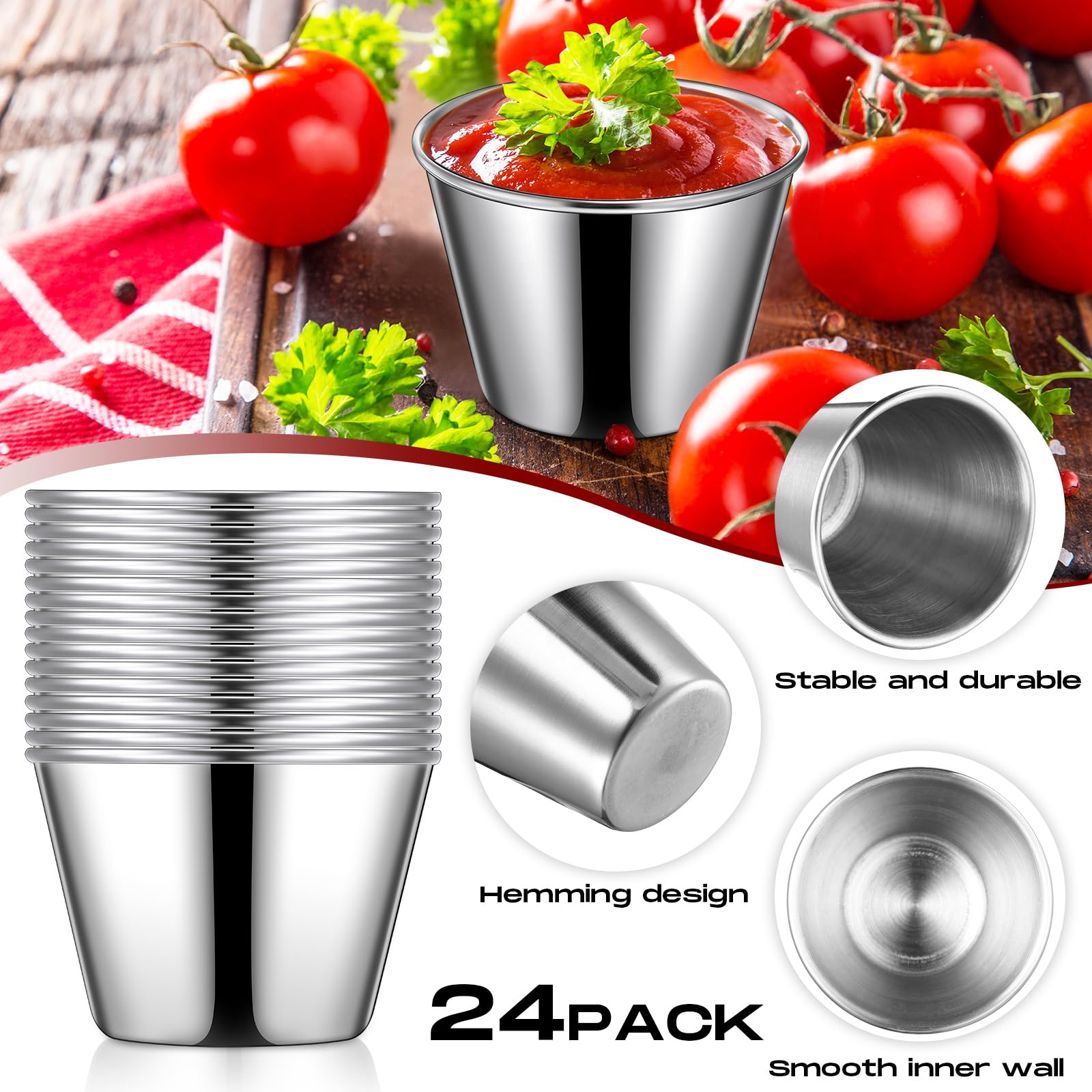 Sufficient Quantity: the package contains 24 pieces of metal condiment cups in silver, the top diameter is about 2.32 inches, the bottom diameter is about 1.46 inches, the height is about 1.57 inches, and the capacity of stainless steel sauce cups is about 2.5 oz, which are enough to satisfy your use and sharing demands, practical tools for kitchen
