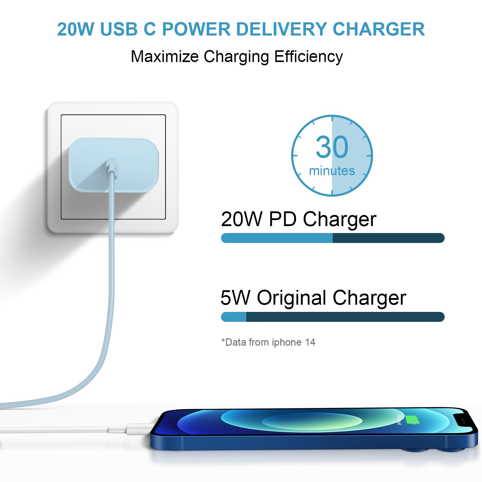 【Romitaz PD 3.0 Fast Charger for i Phone】 i Phone Fast Charger equipped with 20W PD 3.0 USB Type C power delivery wall plug, Firewire Cables PD 3.0 Quick-Charge USB C port provides Max 20W output power, charge your device up to 3x faster than original 5W charger,charging your i Phone 12 up to 50% in just 30 minutes, saving over 1.5hrs for you.